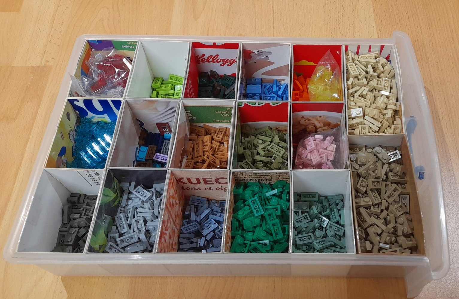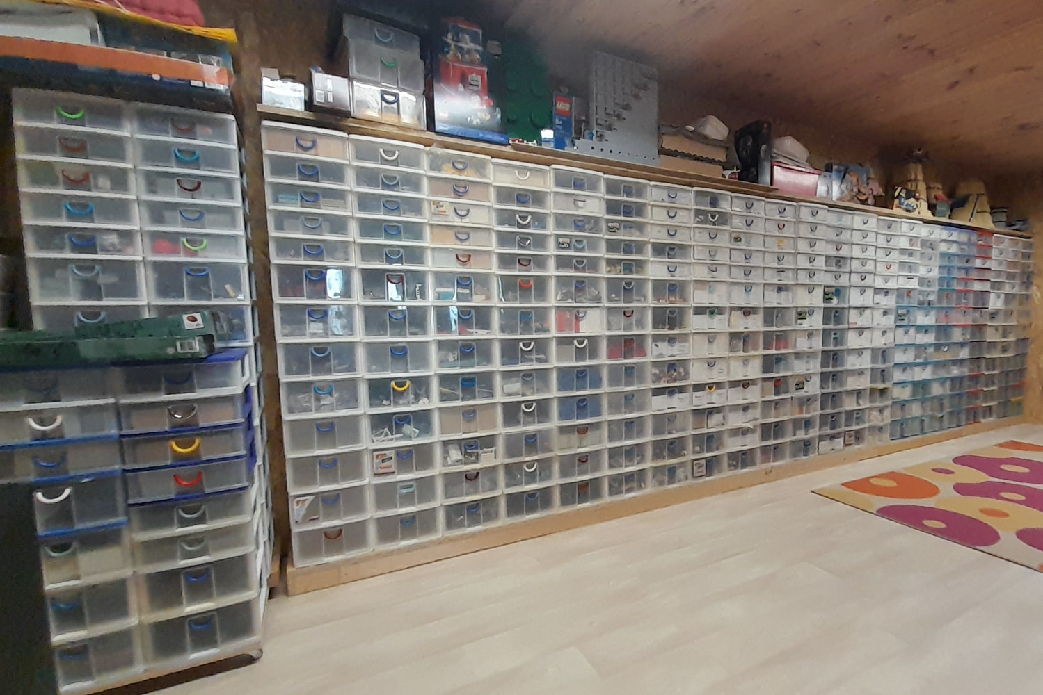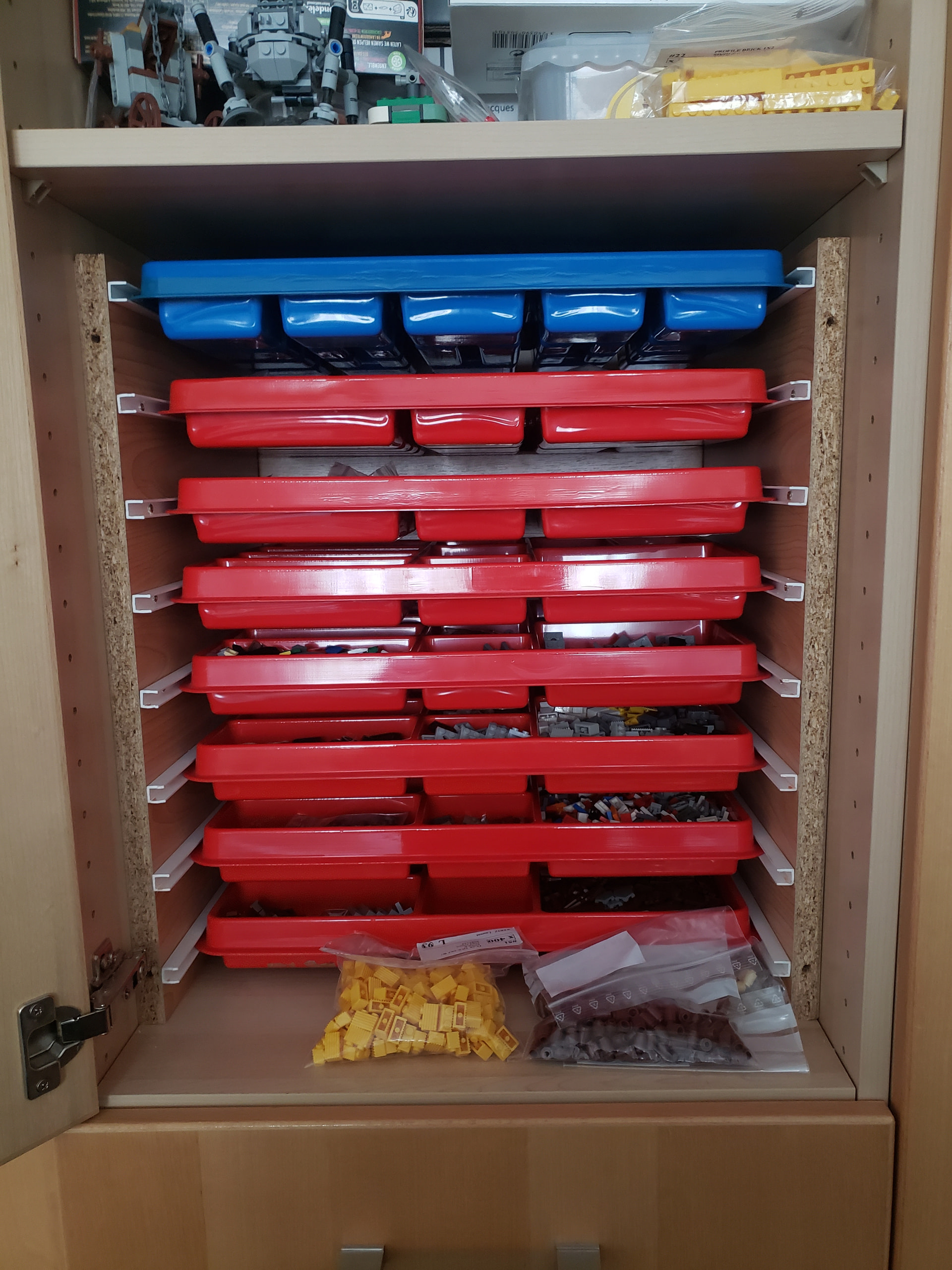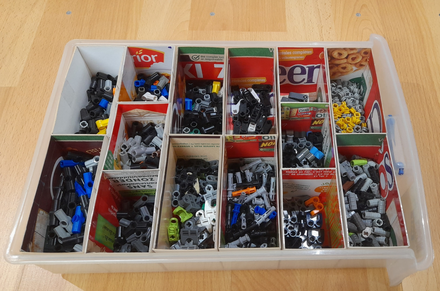 j’organise par formes puis par couleurs en fonction du volume. Les briques et plates étaient dans plusieurs boîtes à chaussures et certaines pièces comme les techniques dans des petits meubles à casiers type quincaillerie.
