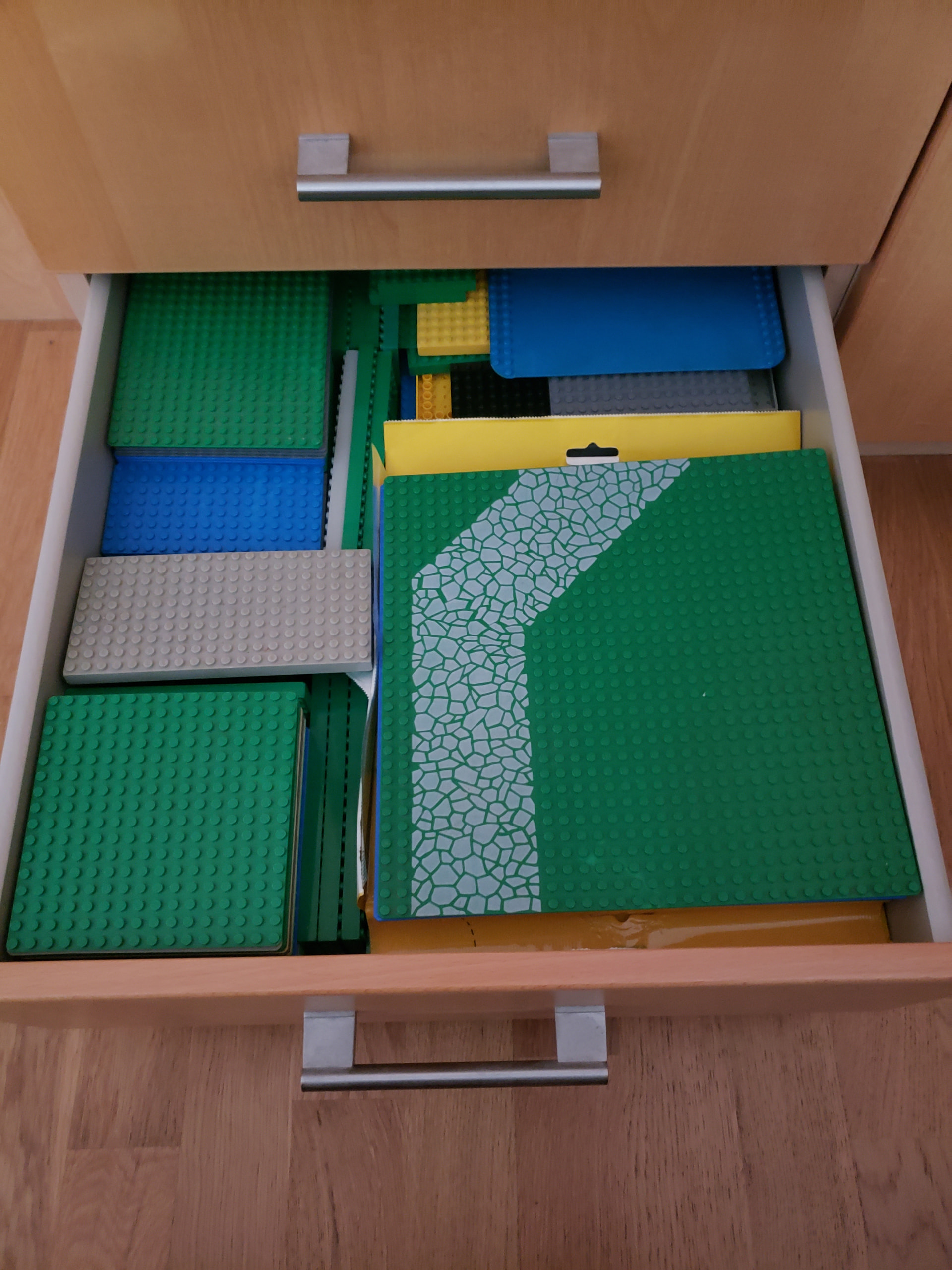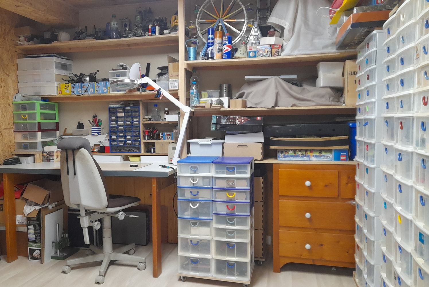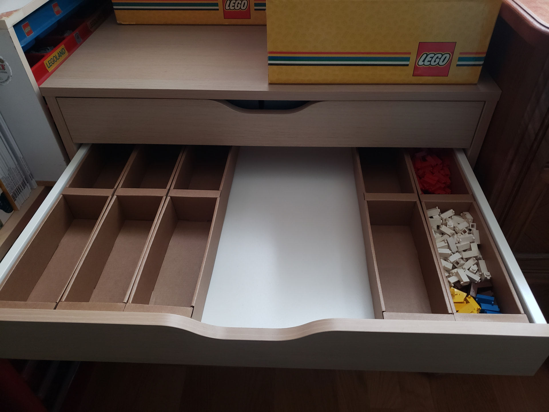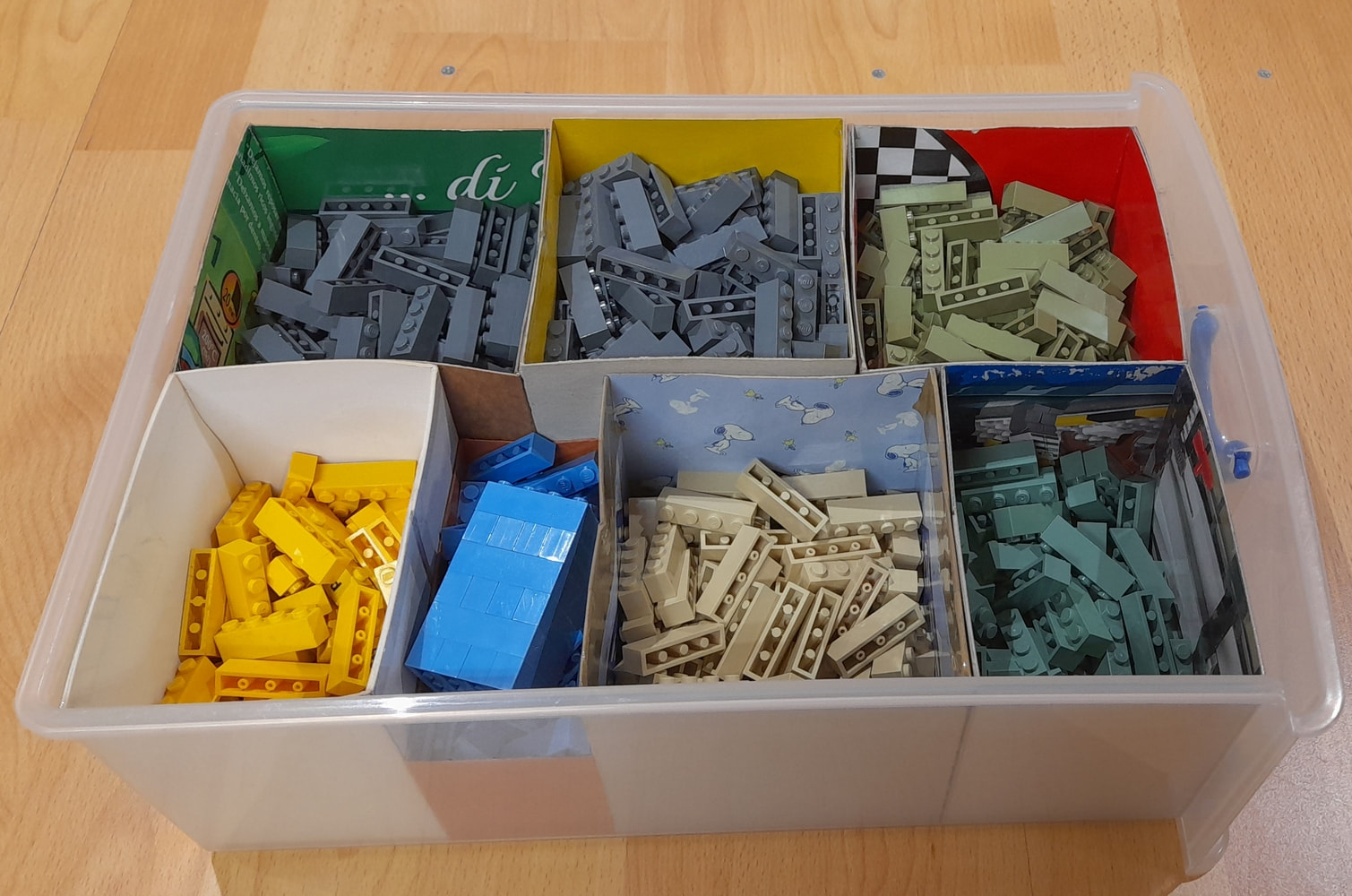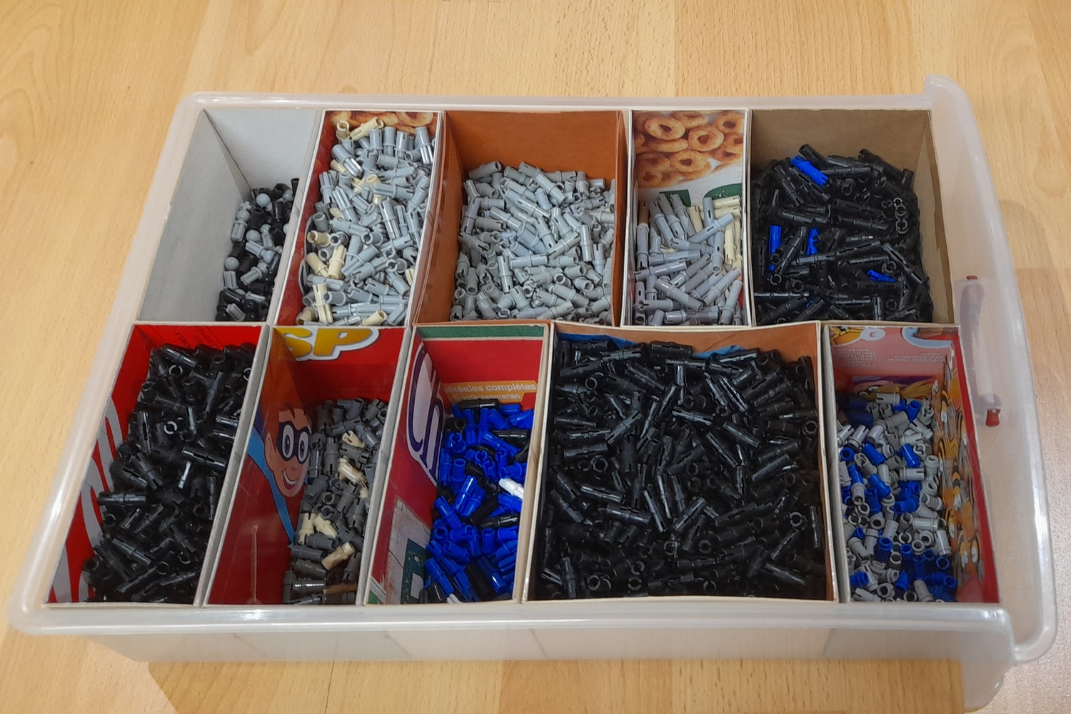 j’organise par formes puis par couleurs en fonction du volume. Les briques et plates étaient dans plusieurs boîtes à chaussures et certaines pièces comme les techniques dans des petits meubles à casiers type quincaillerie.