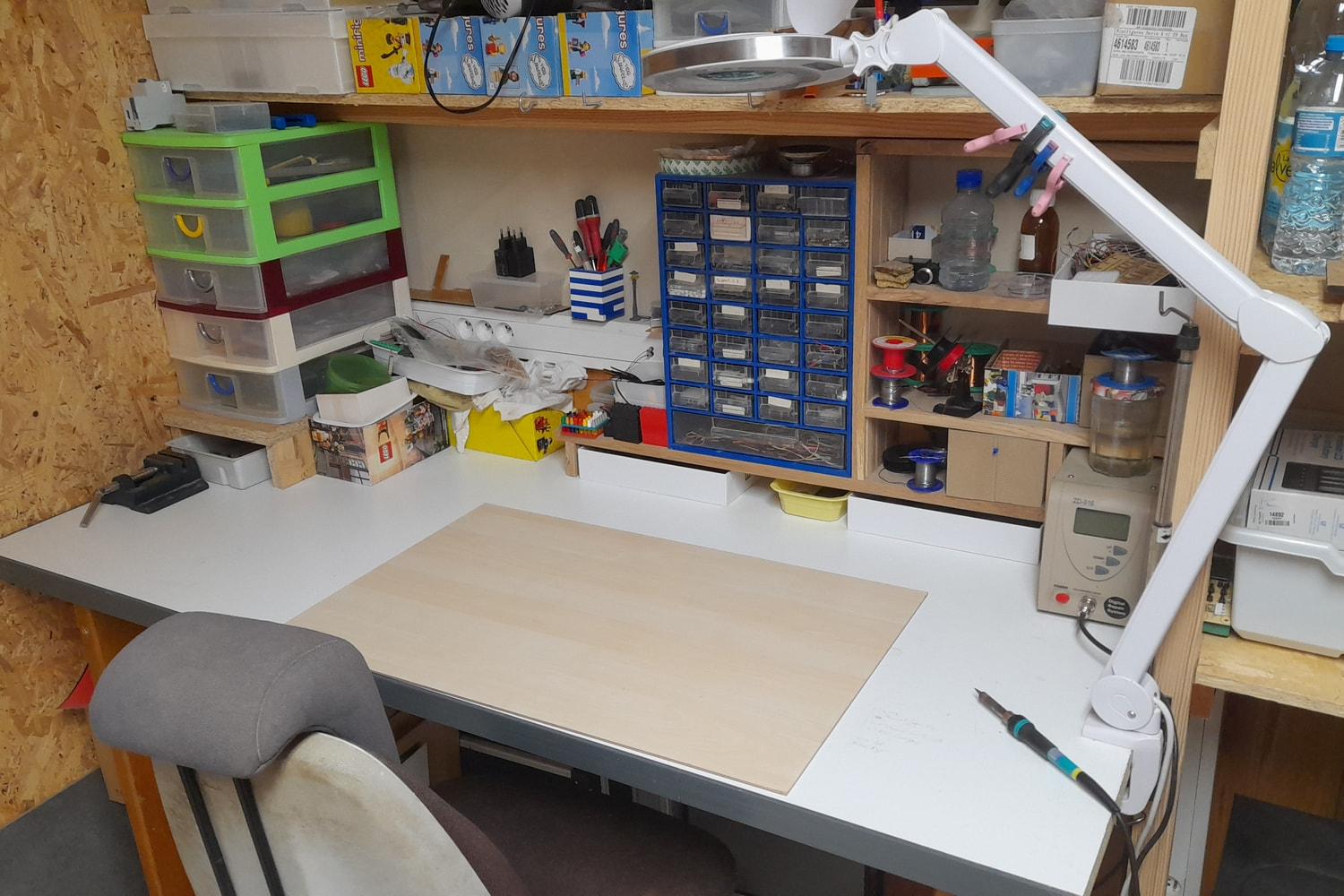 Mon bureau de construction sur des meubles un peu plus bas que ceux pour les étagères. La photo date un peu mais le bureau est toujours autant encombré par mes constructions…