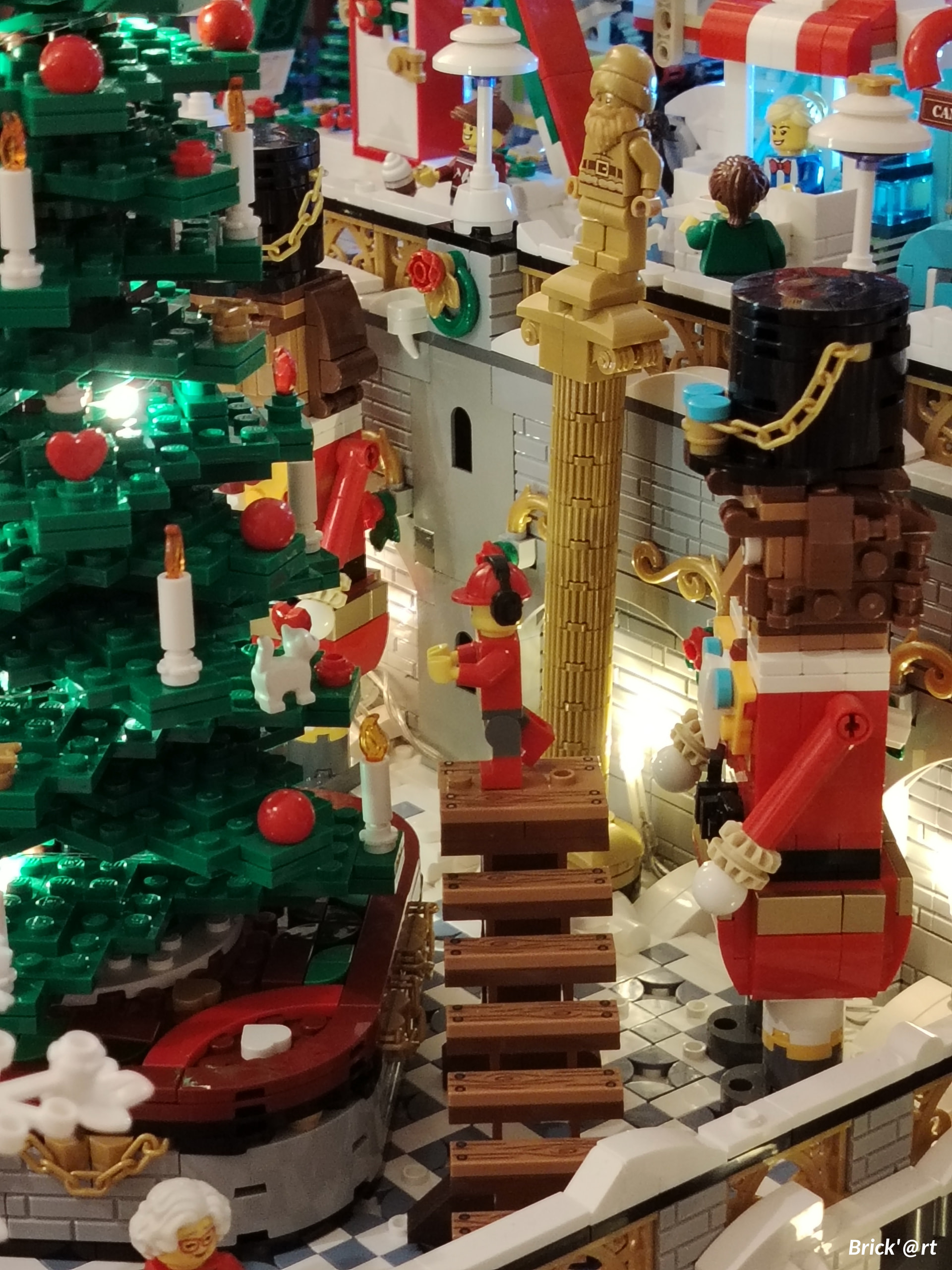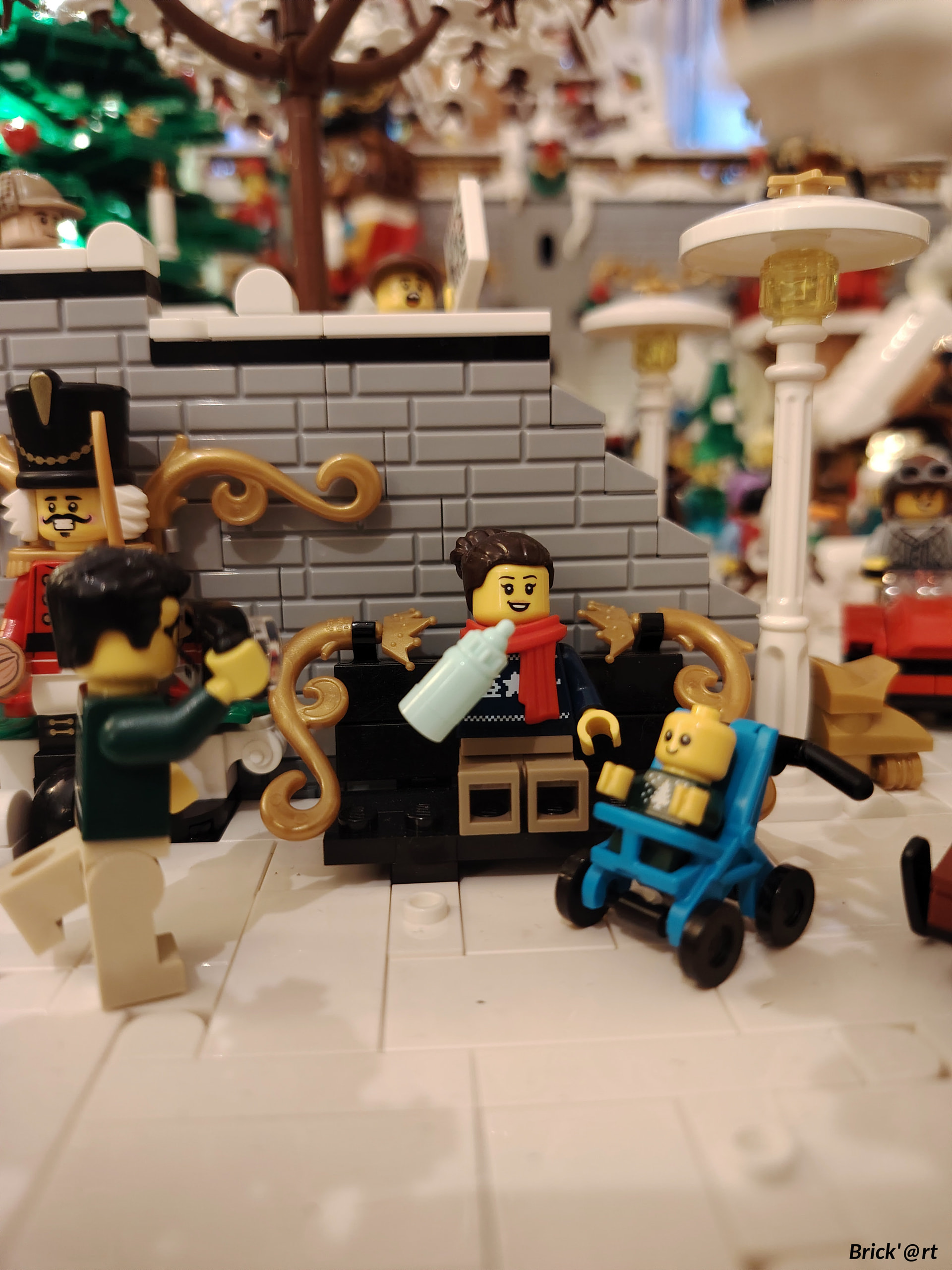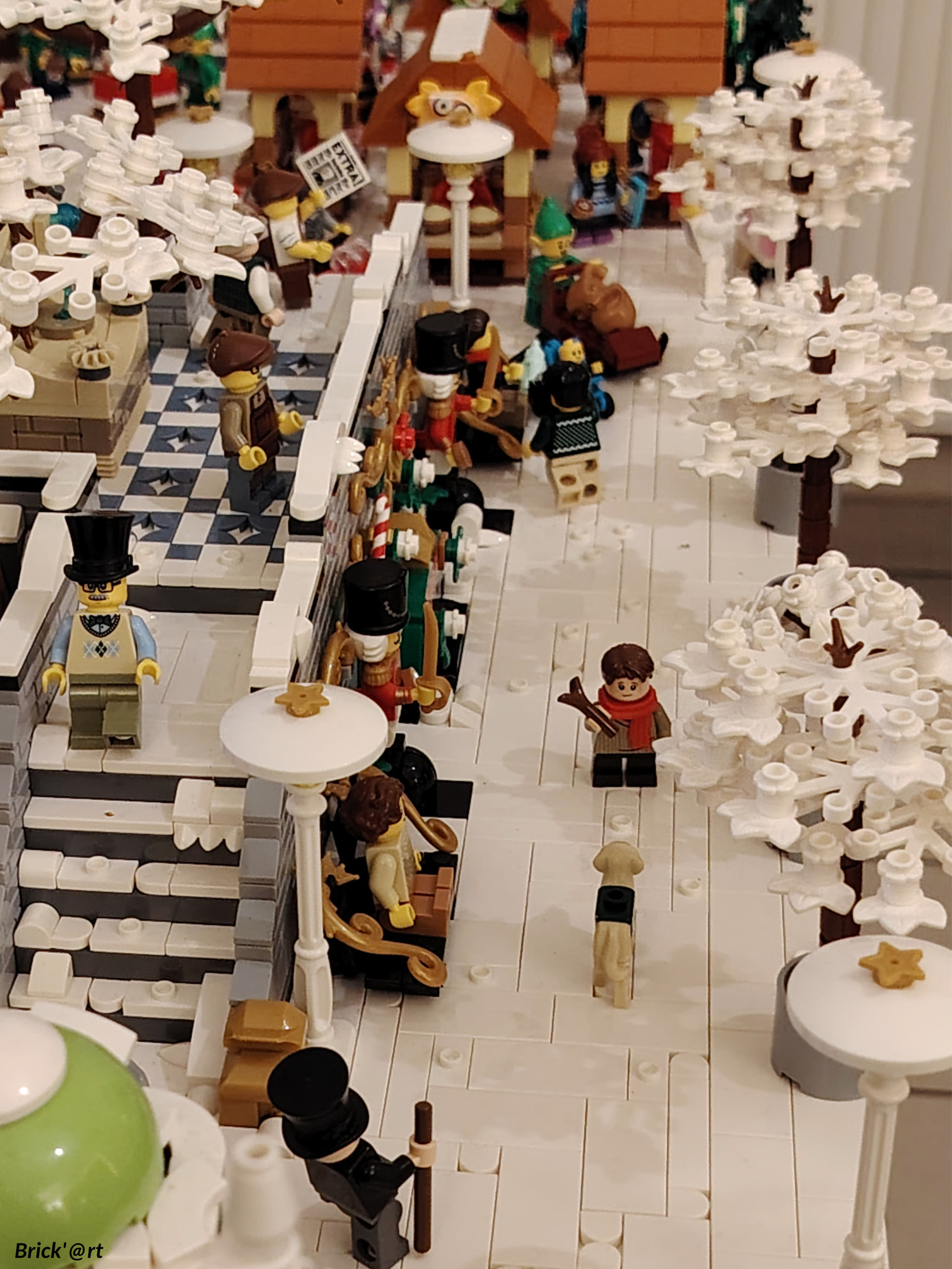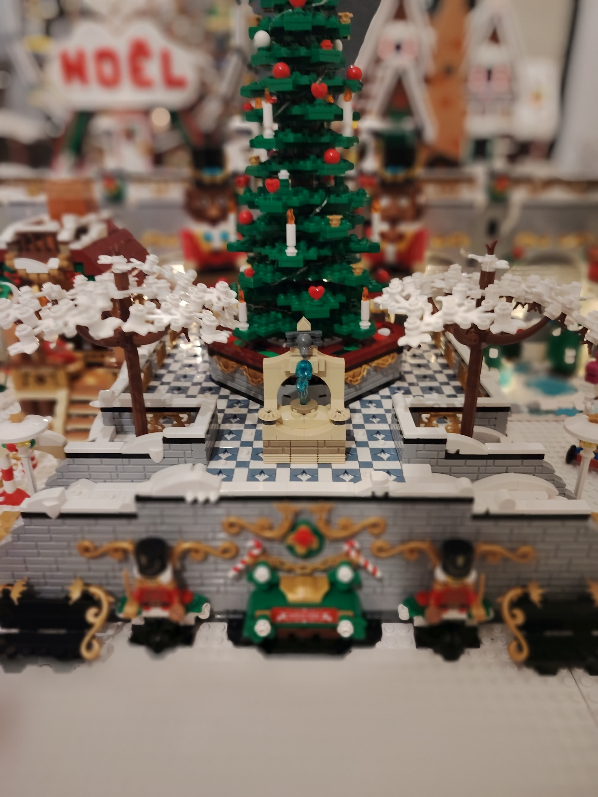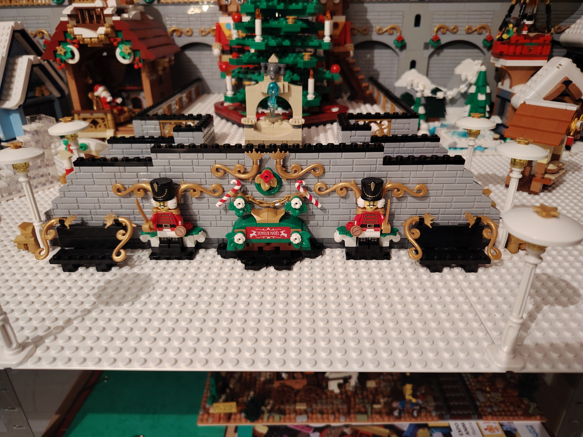 - un espace central au premier plan comprenant une brique custom « Joyeux Noël » accompagné de 2 Casse noisettes en minifigs et 2 bancs