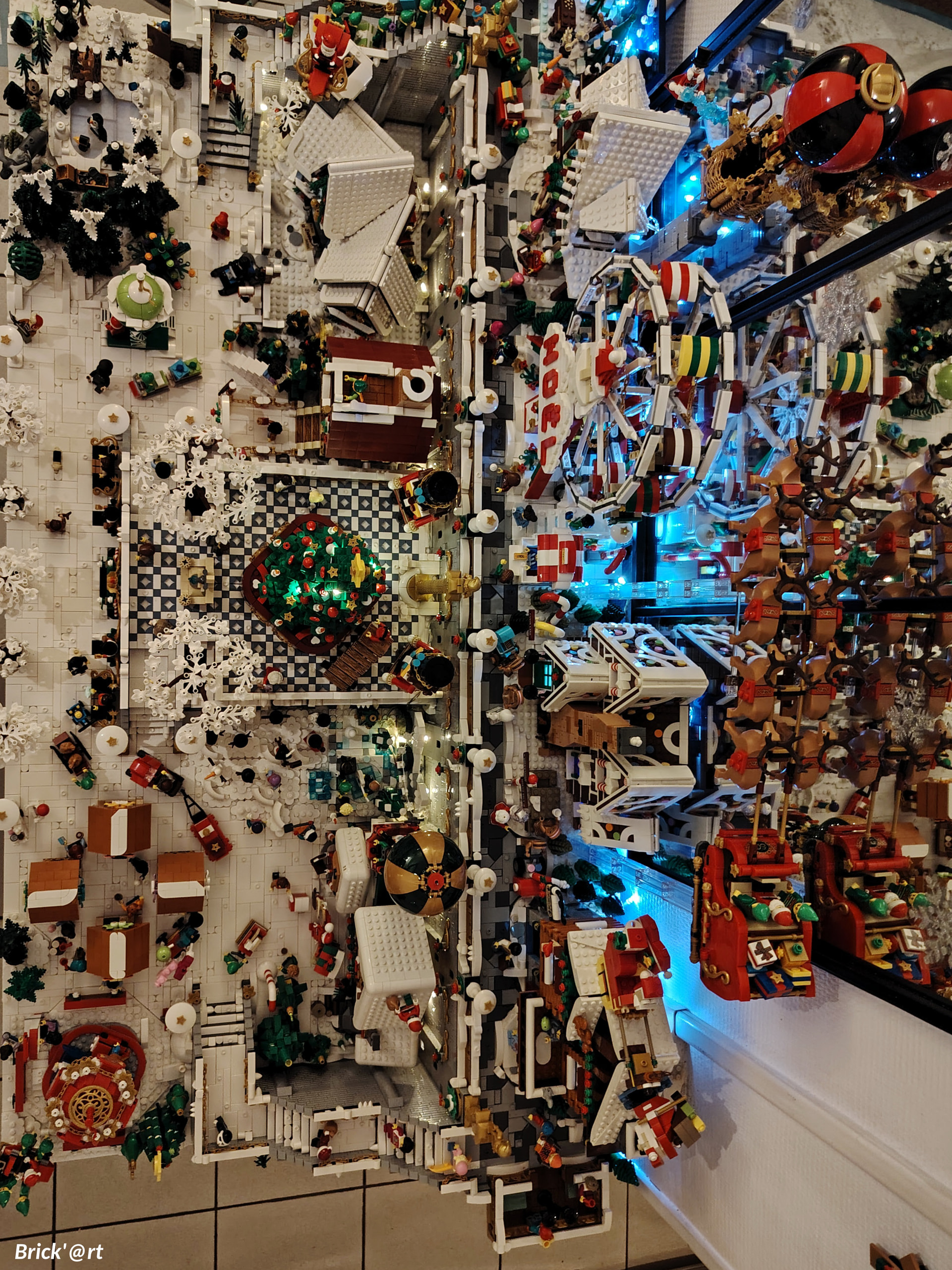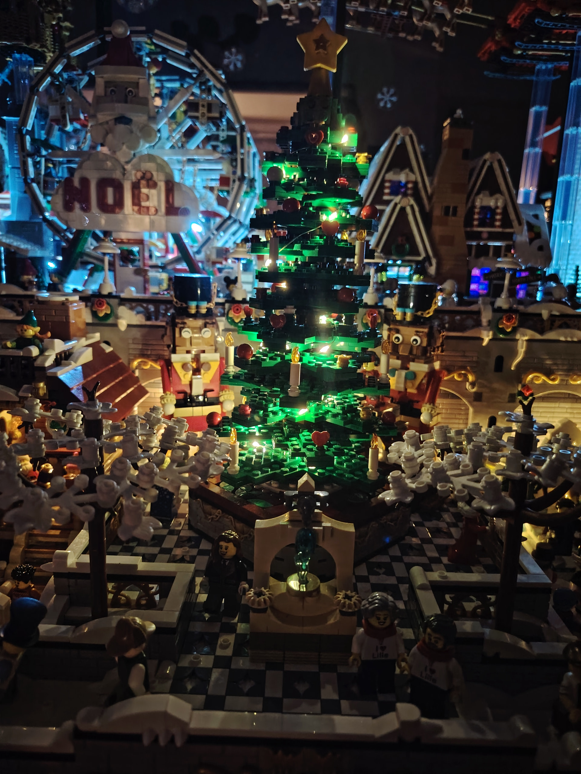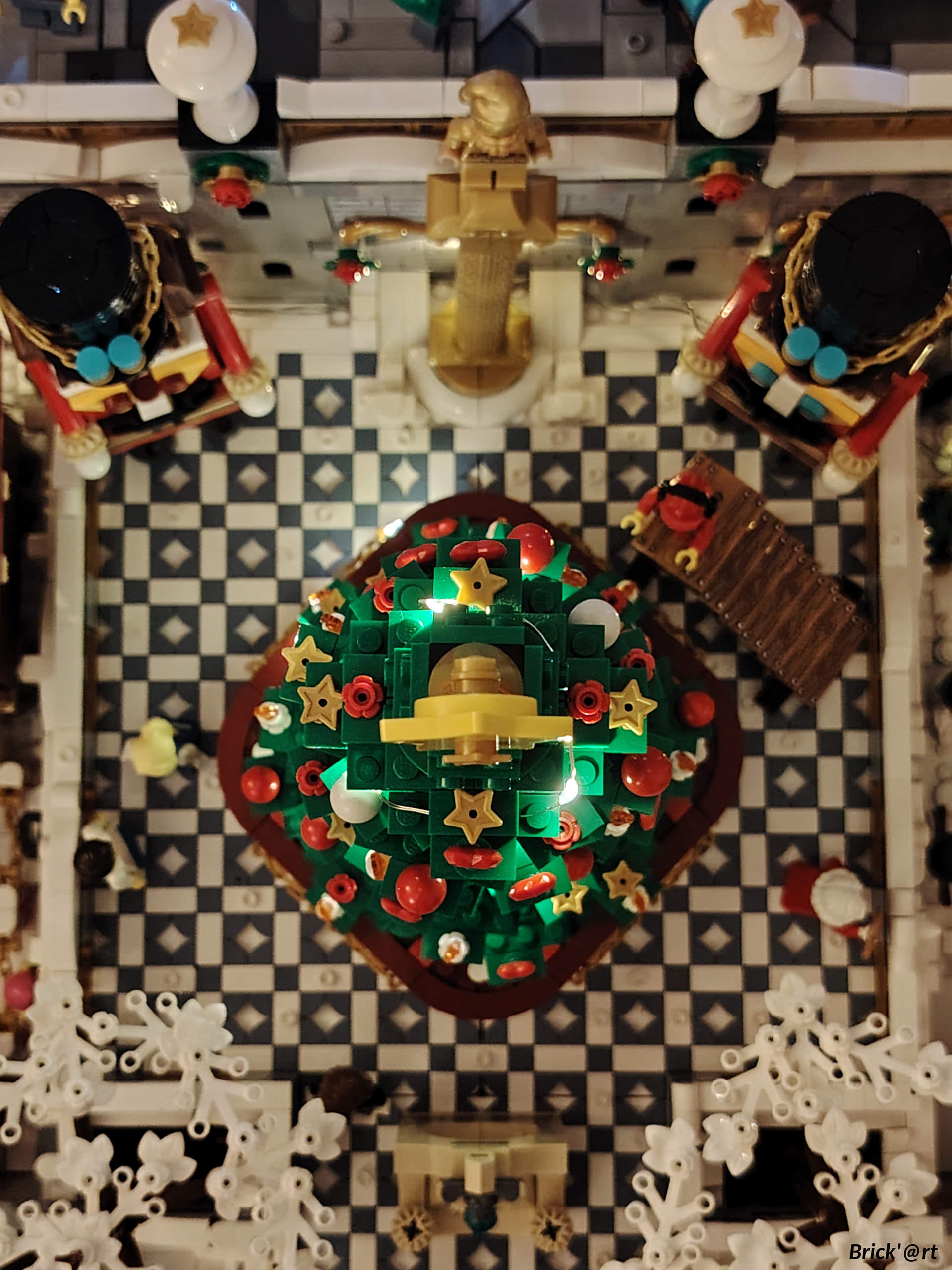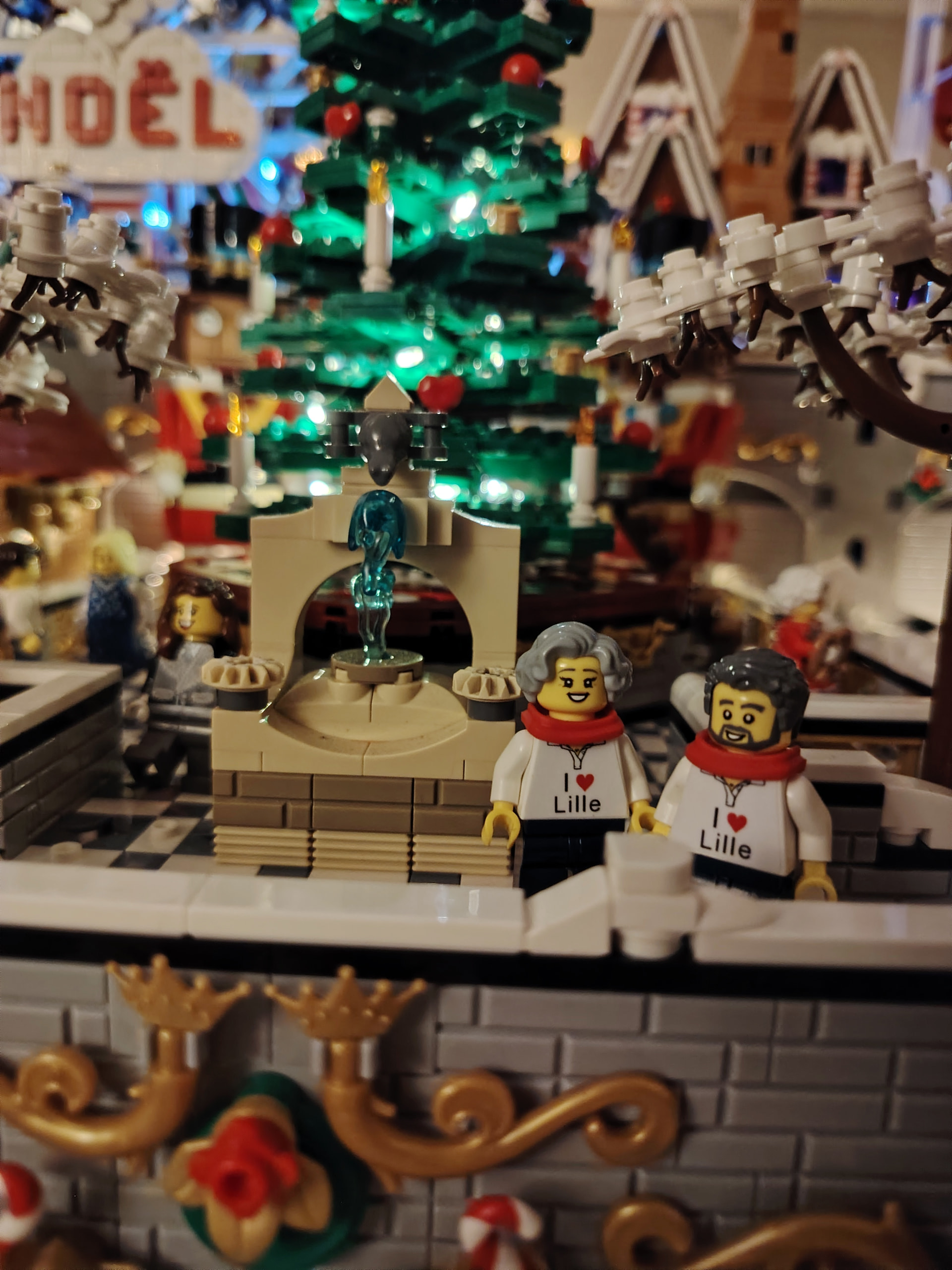 - un espace central au premier plan comprenant une brique custom « Joyeux Noël » accompagné de 2 Casse noisettes en minifigs et 2 bancs