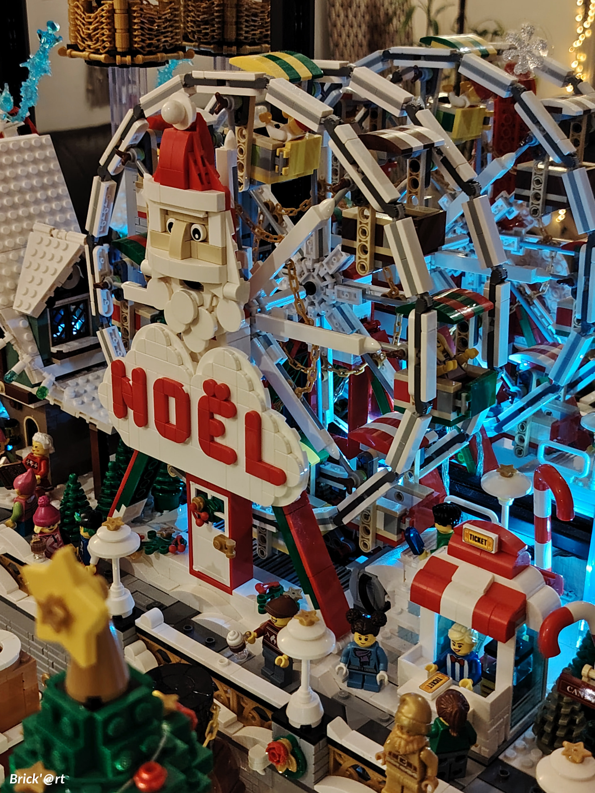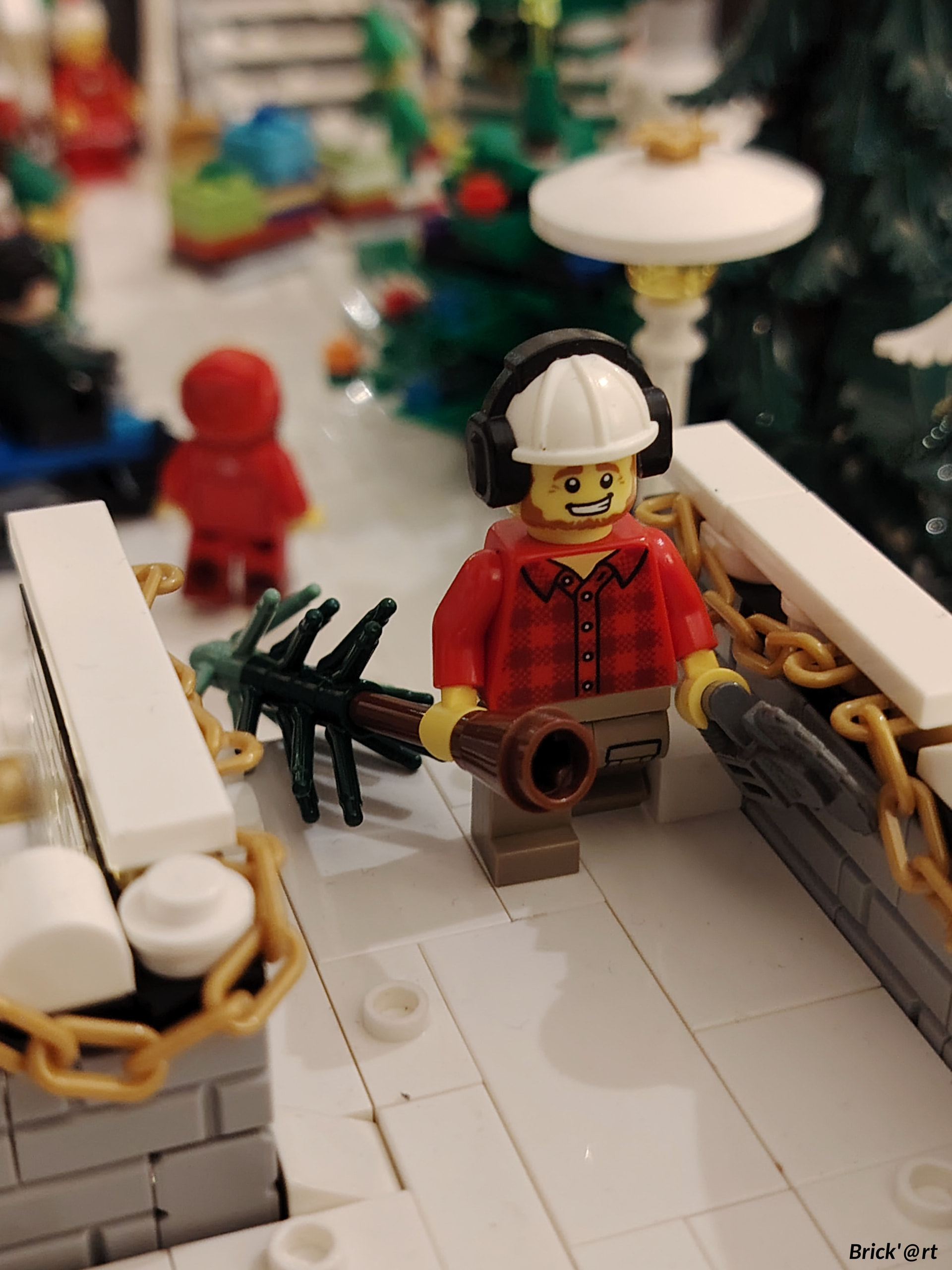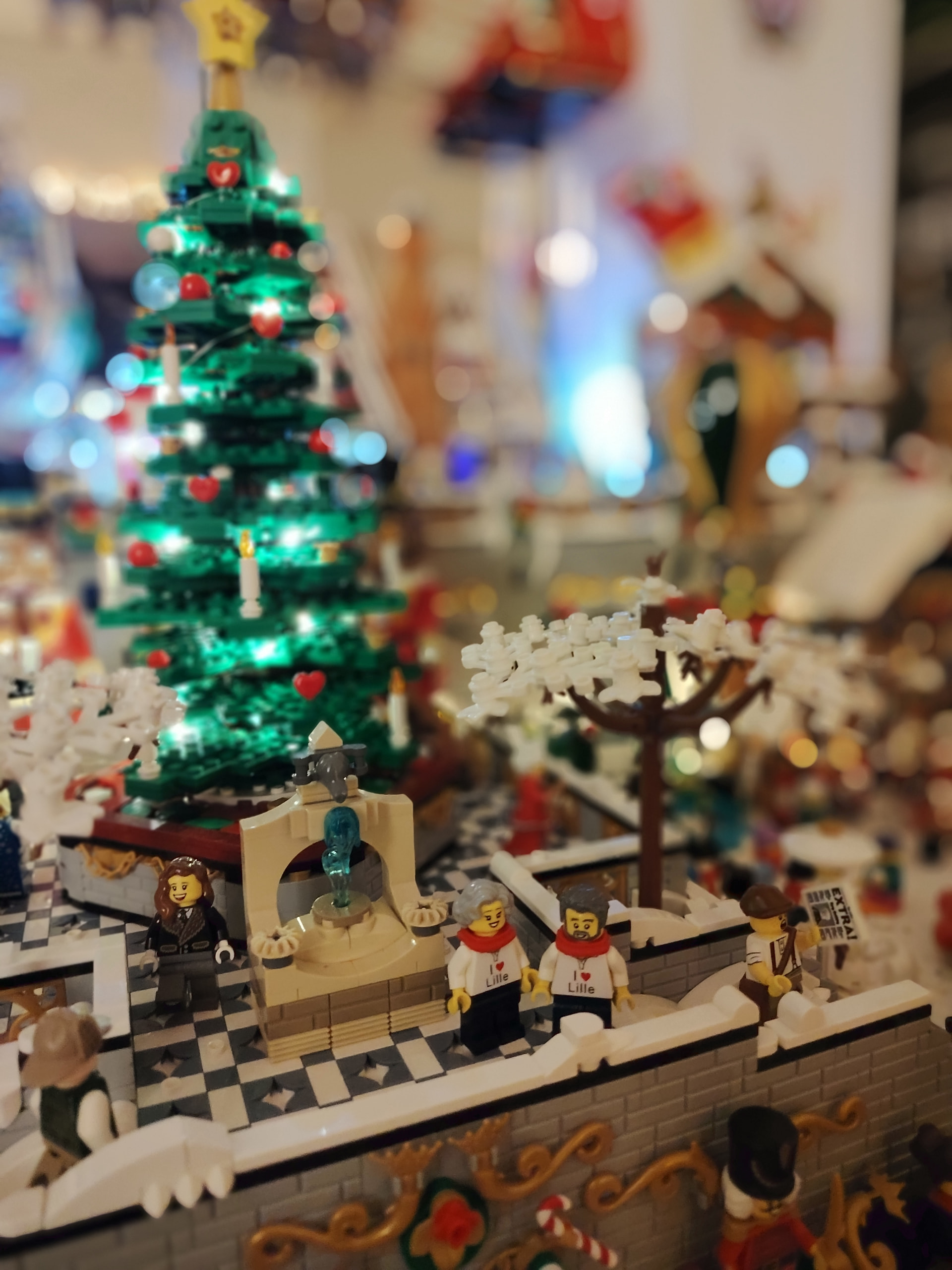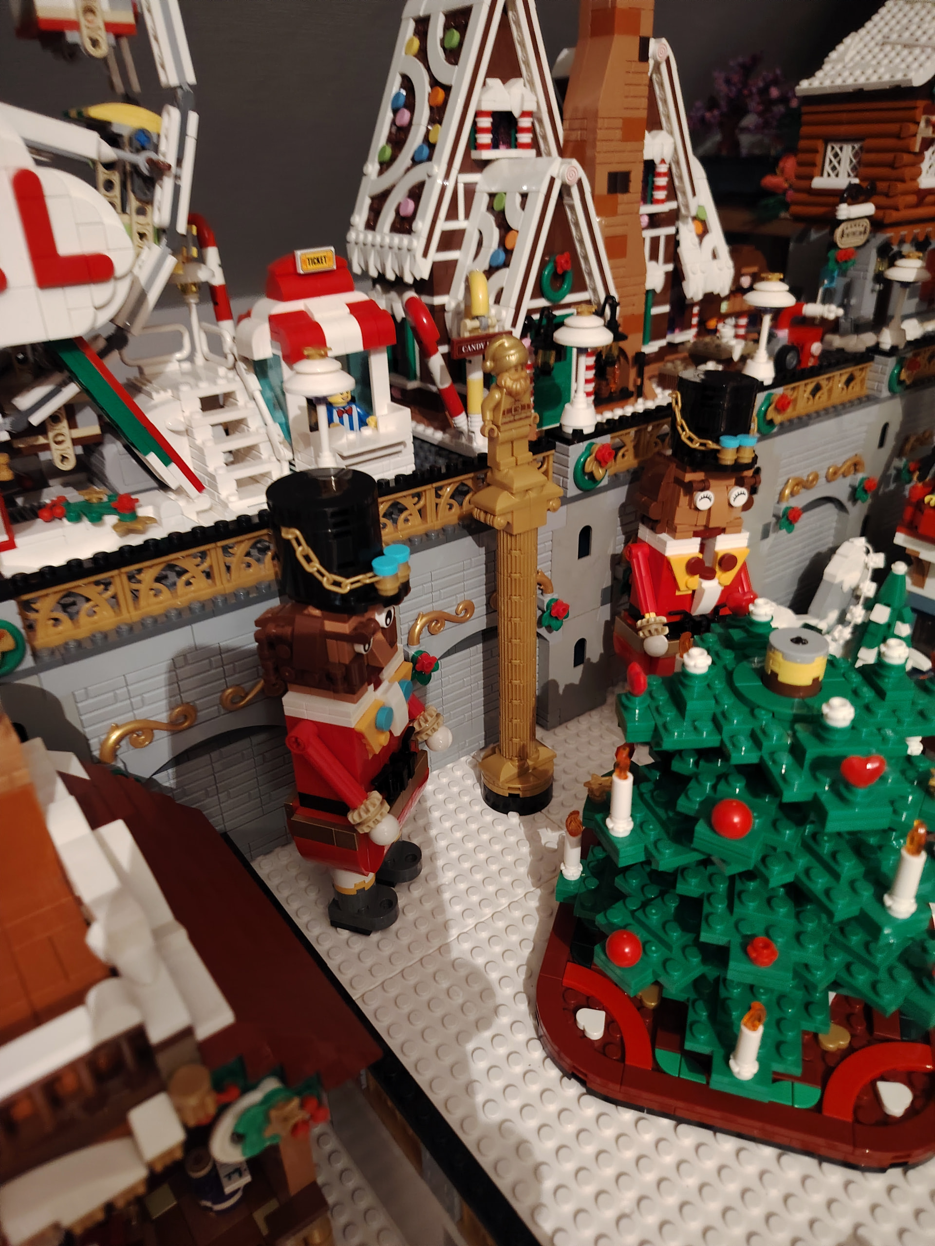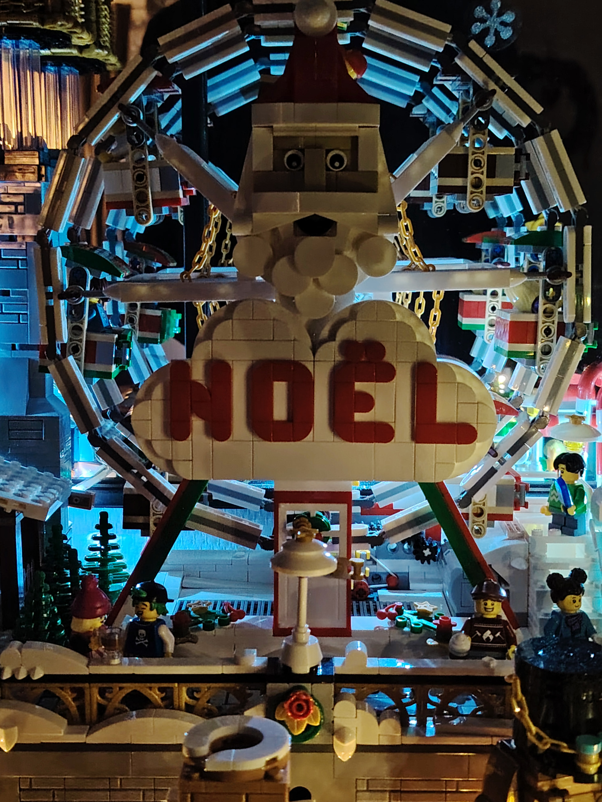 - un espace central au premier plan comprenant une brique custom « Joyeux Noël » accompagné de 2 Casse noisettes en minifigs et 2 bancs