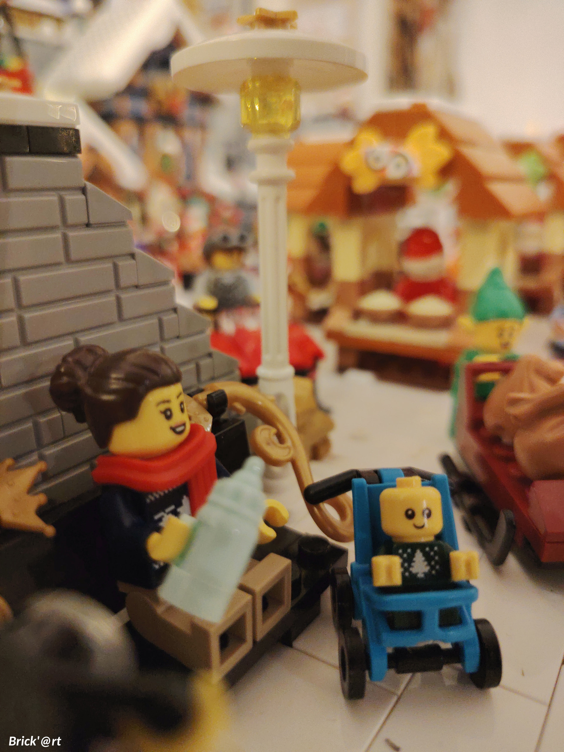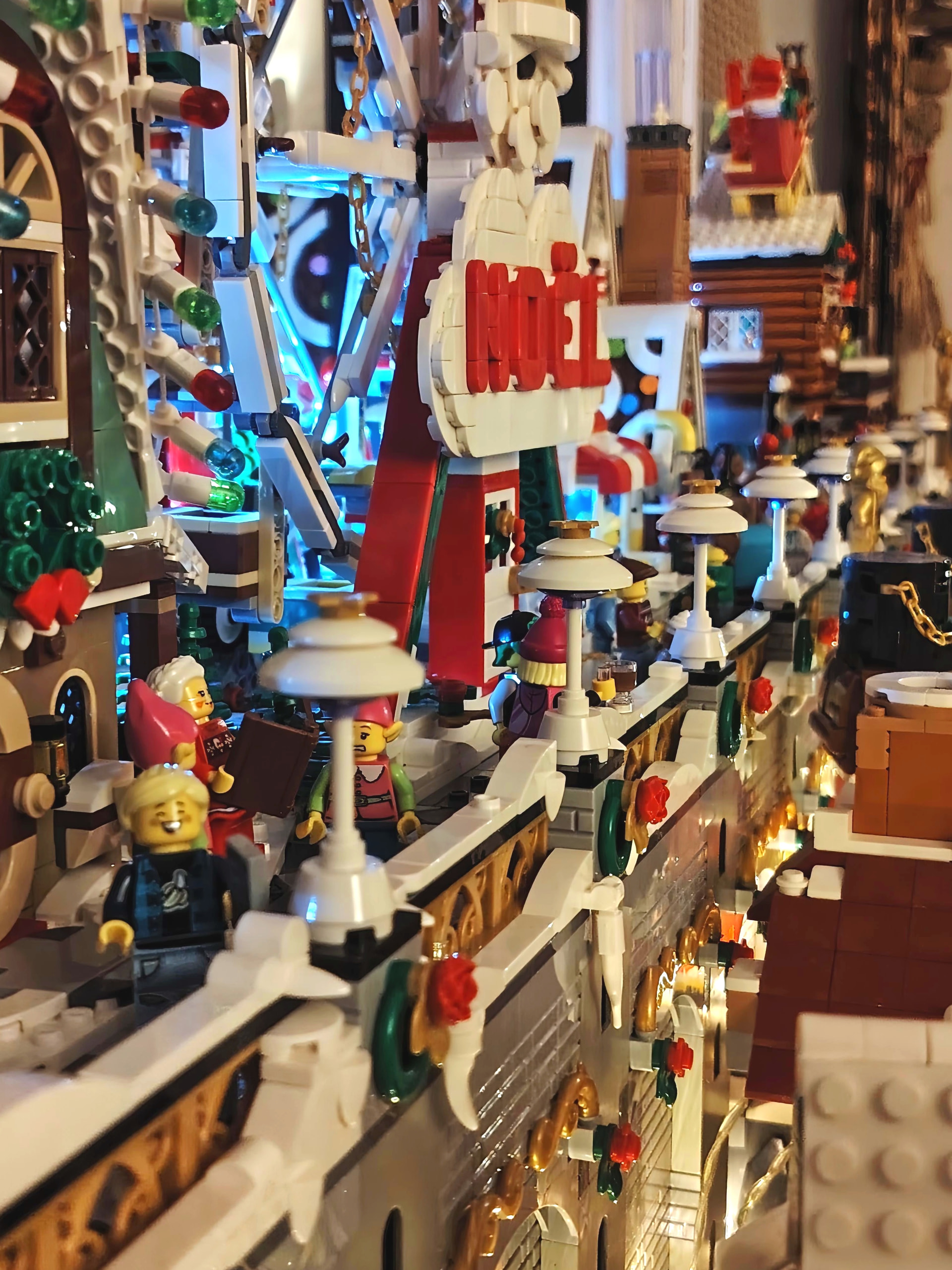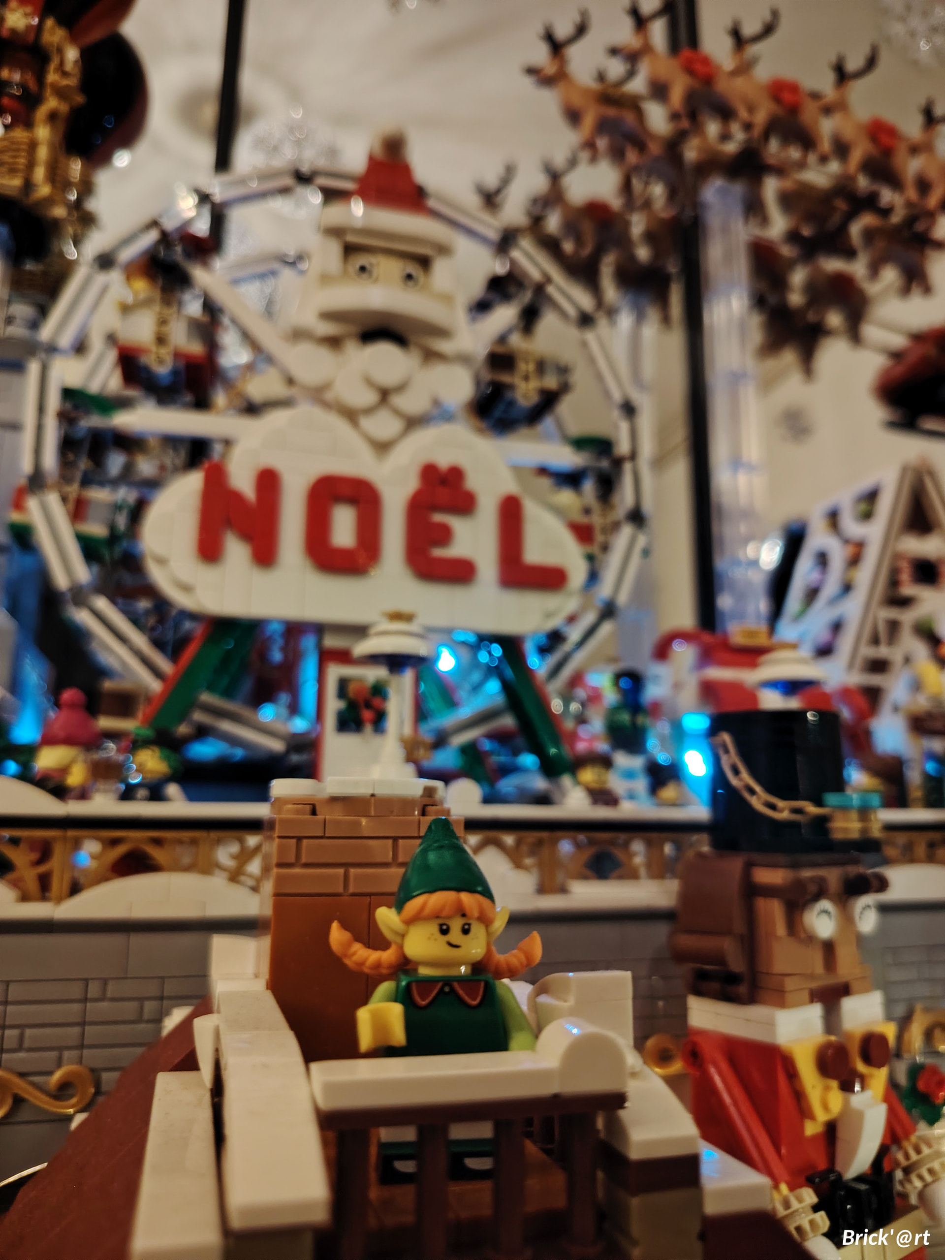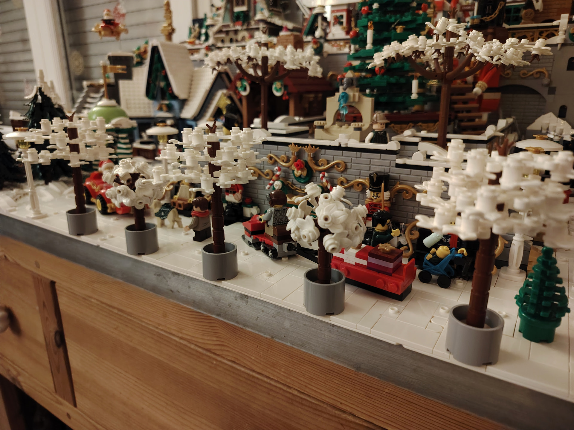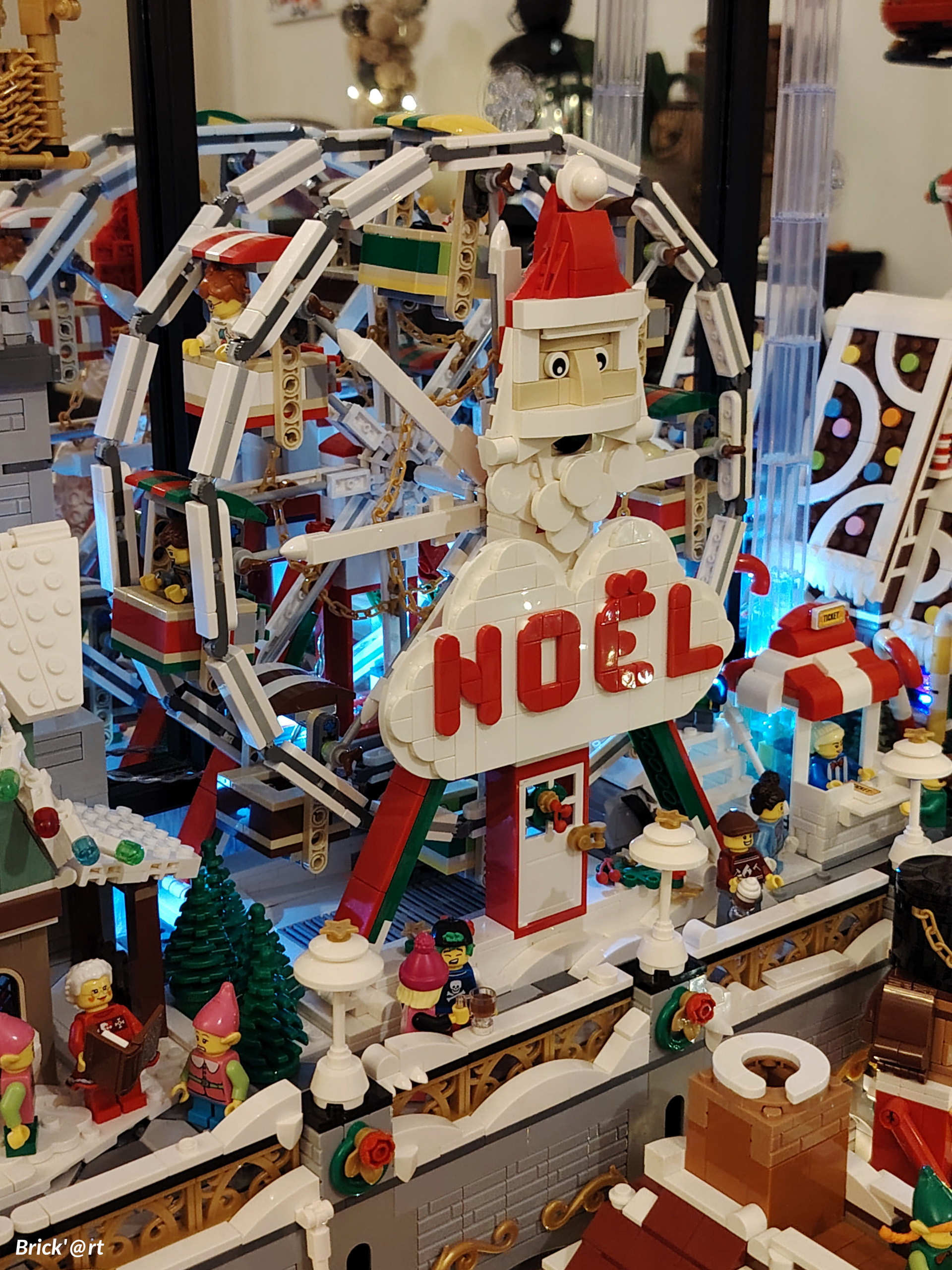 - un espace central au premier plan comprenant une brique custom « Joyeux Noël » accompagné de 2 Casse noisettes en minifigs et 2 bancs