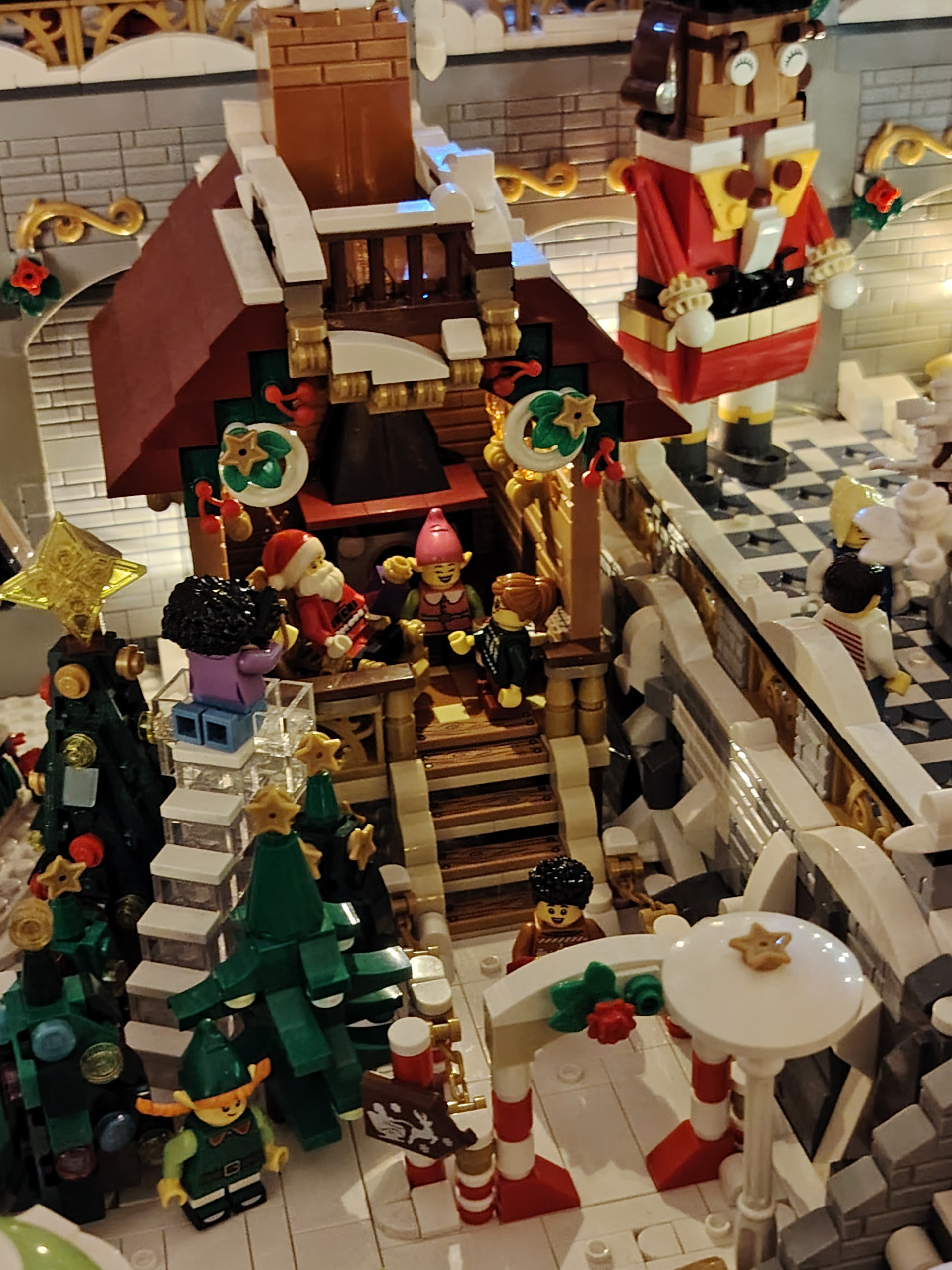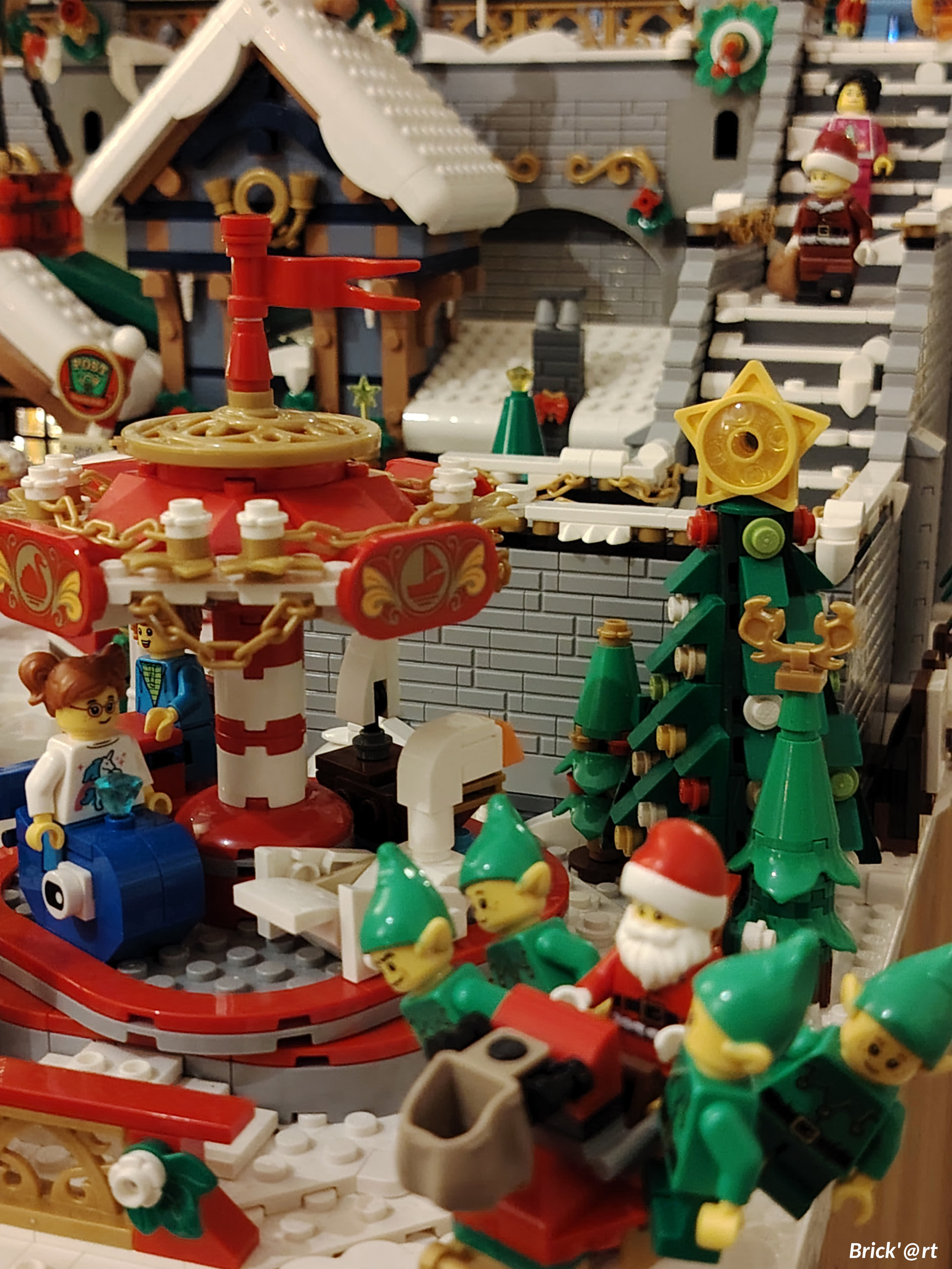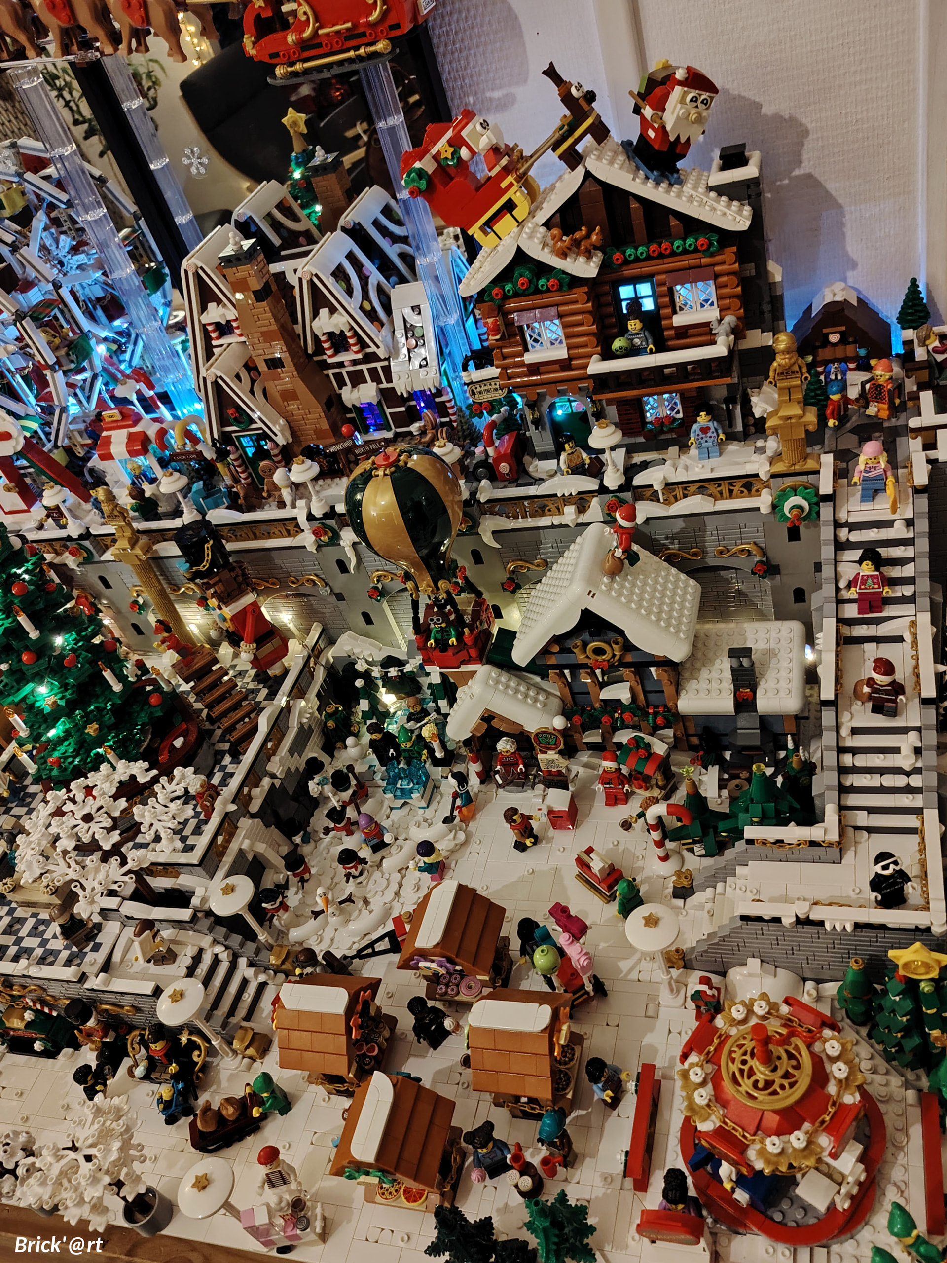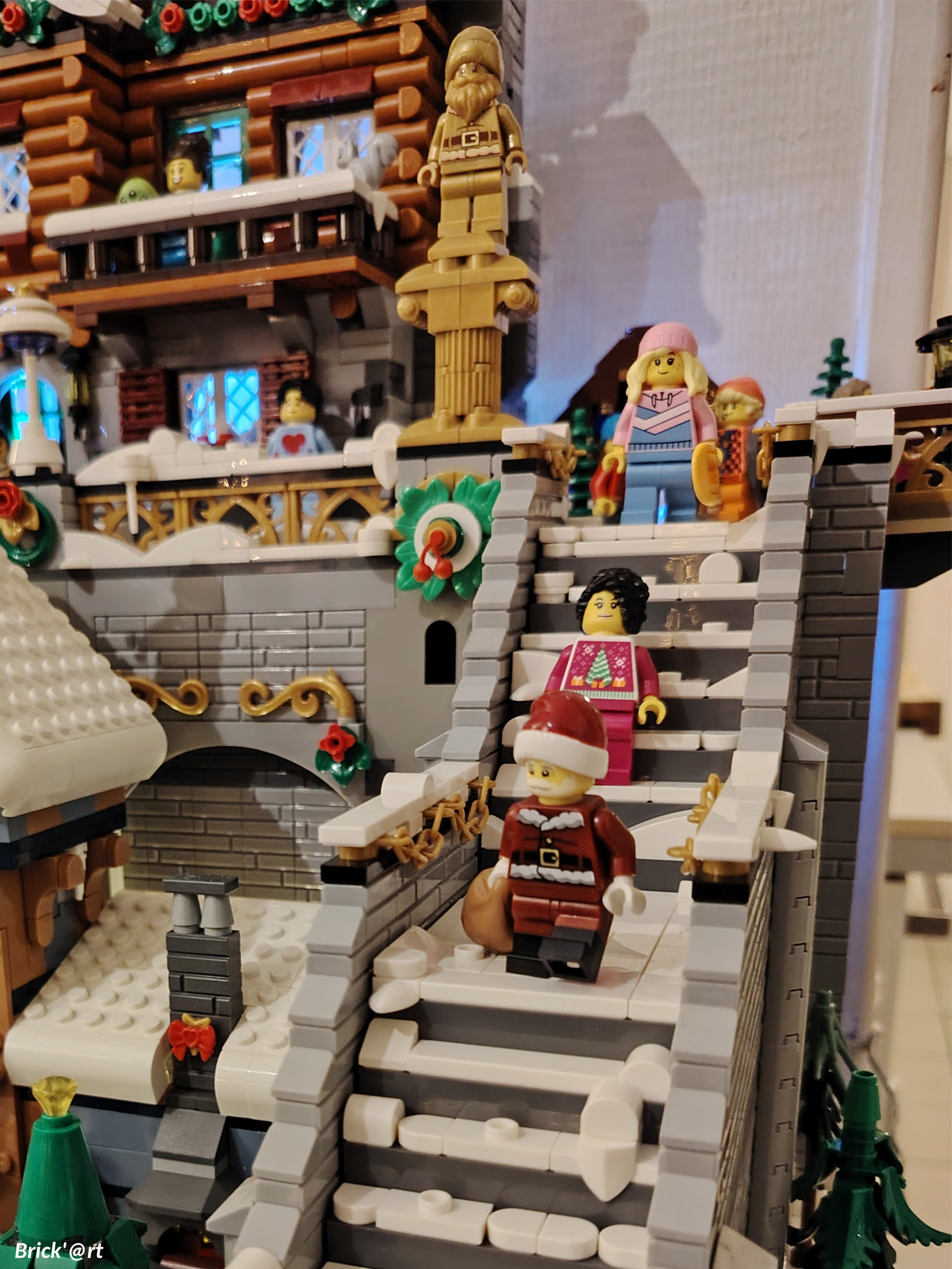 - un espace central au premier plan comprenant une brique custom « Joyeux Noël » accompagné de 2 Casse noisettes en minifigs et 2 bancs