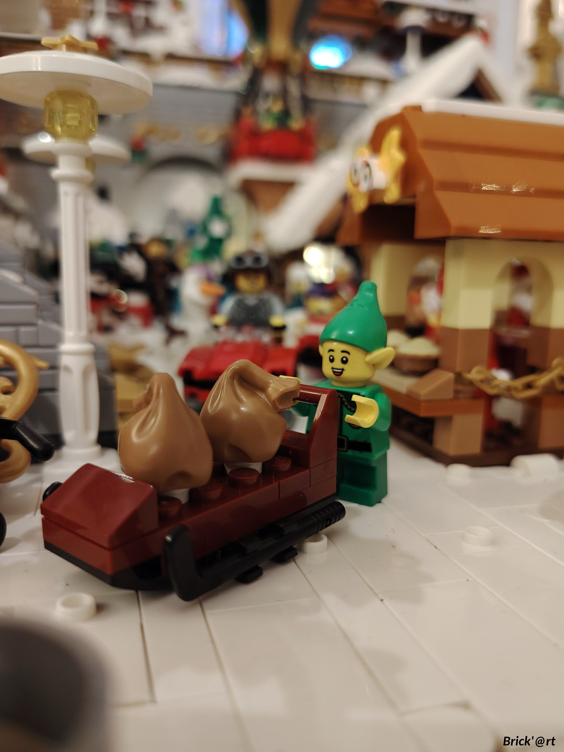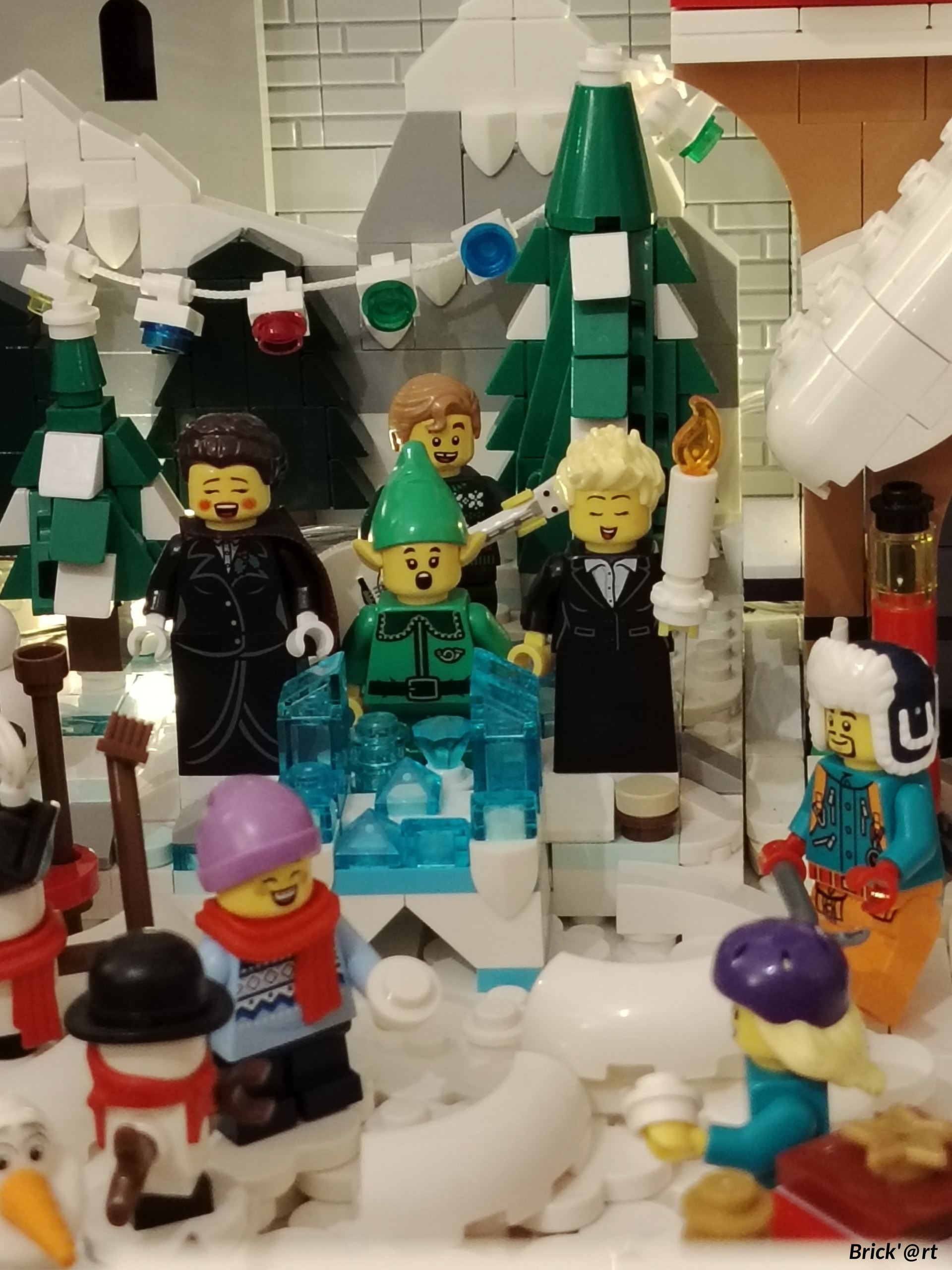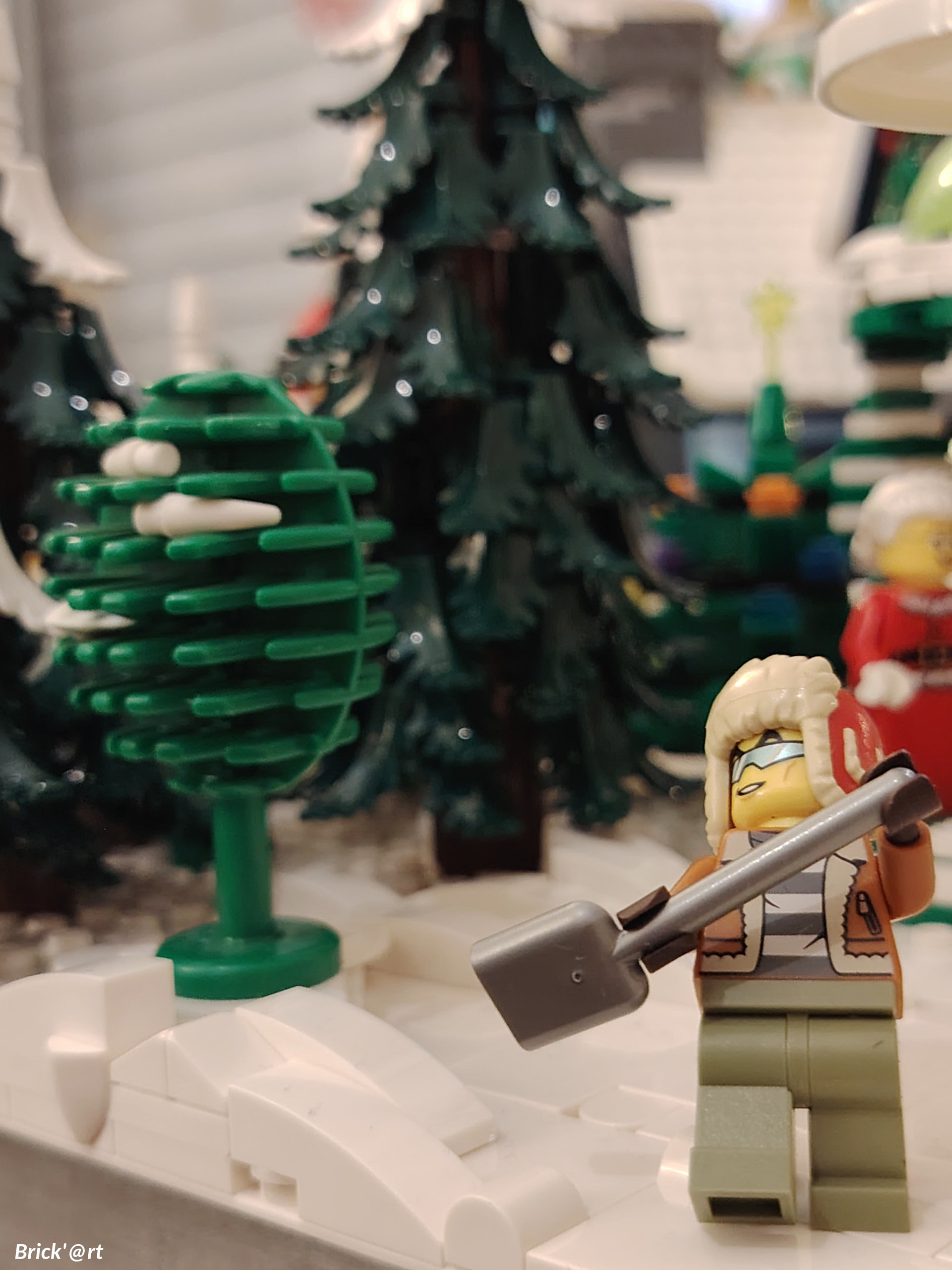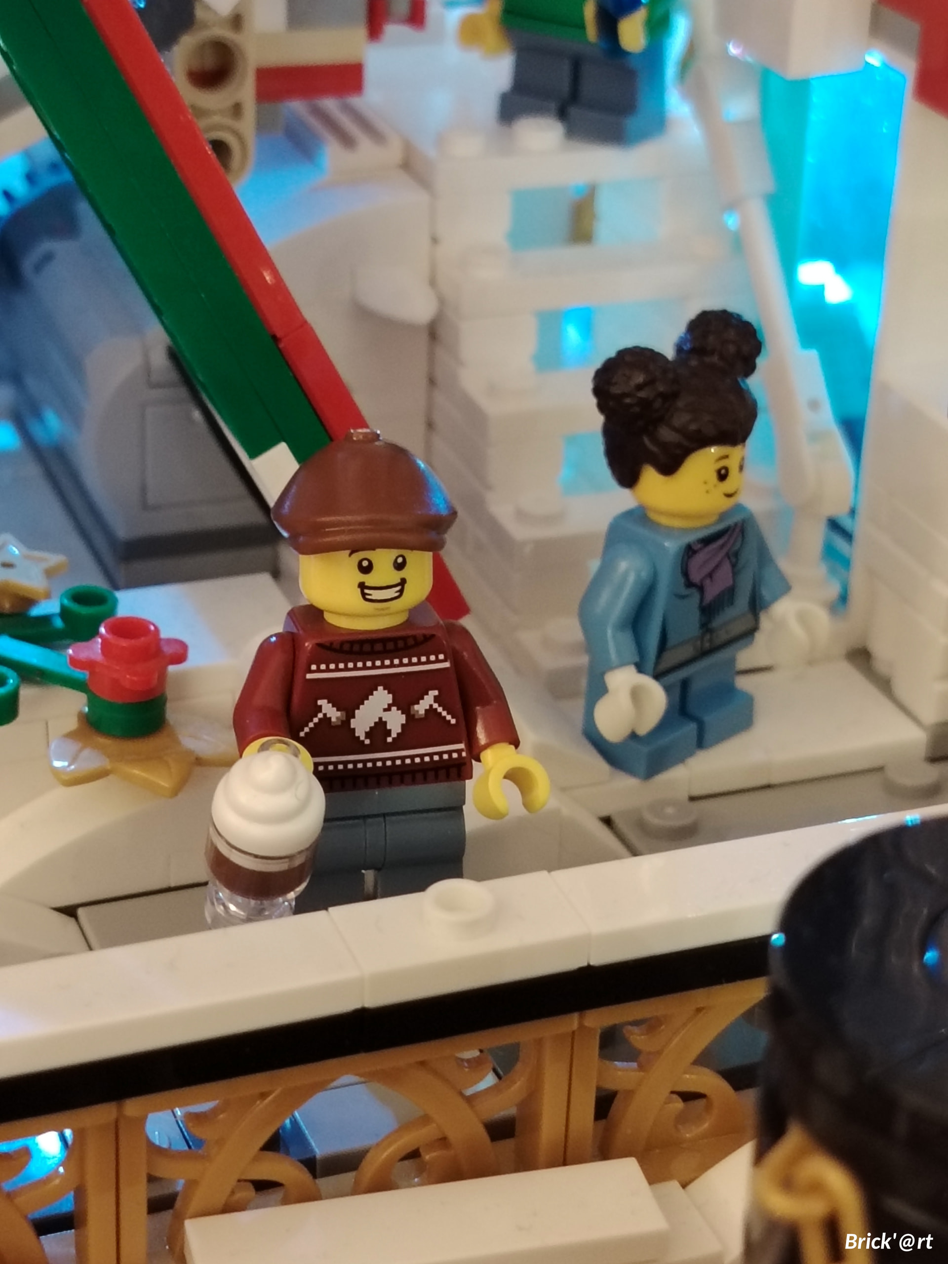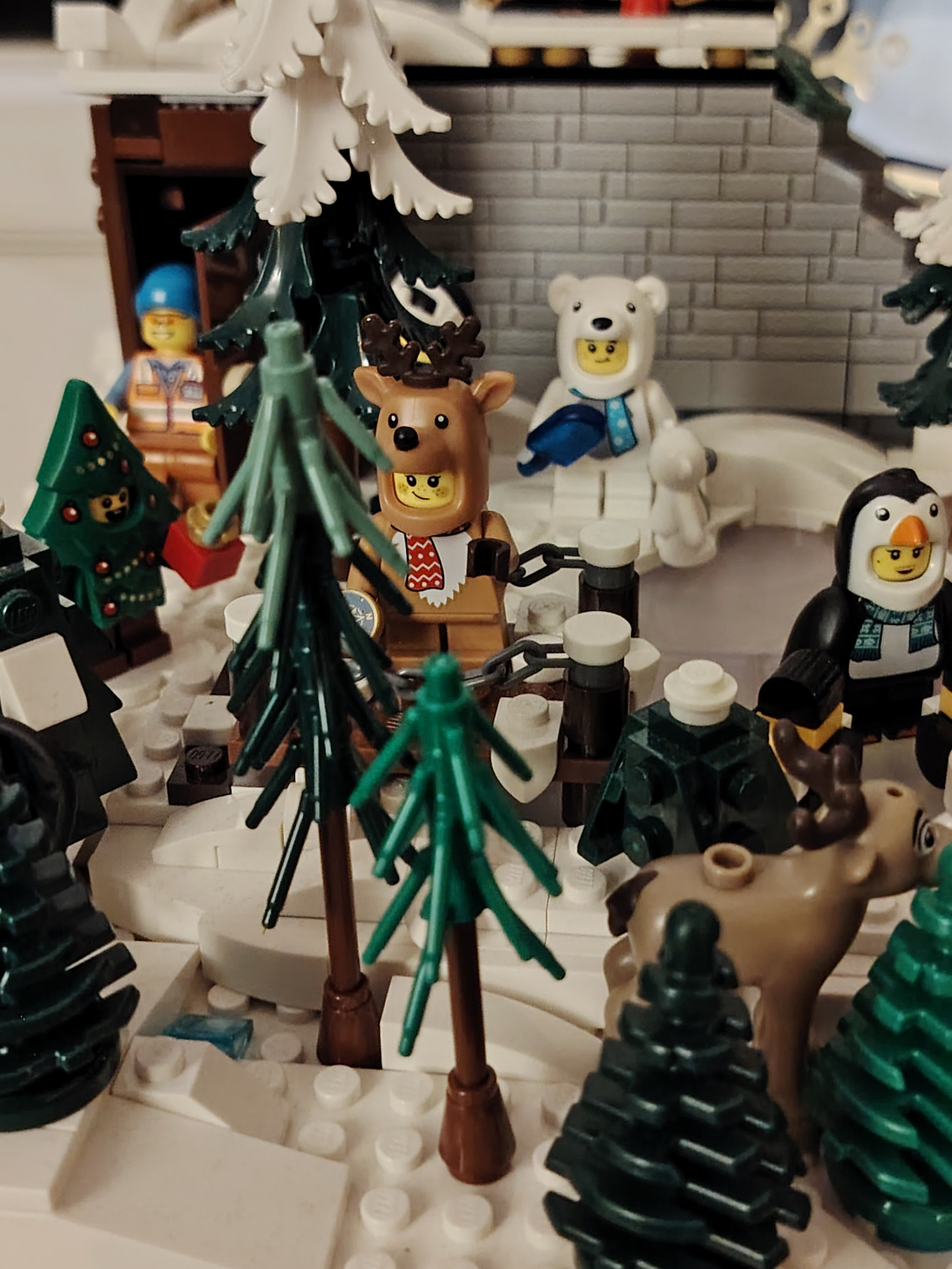 - un espace central au premier plan comprenant une brique custom « Joyeux Noël » accompagné de 2 Casse noisettes en minifigs et 2 bancs