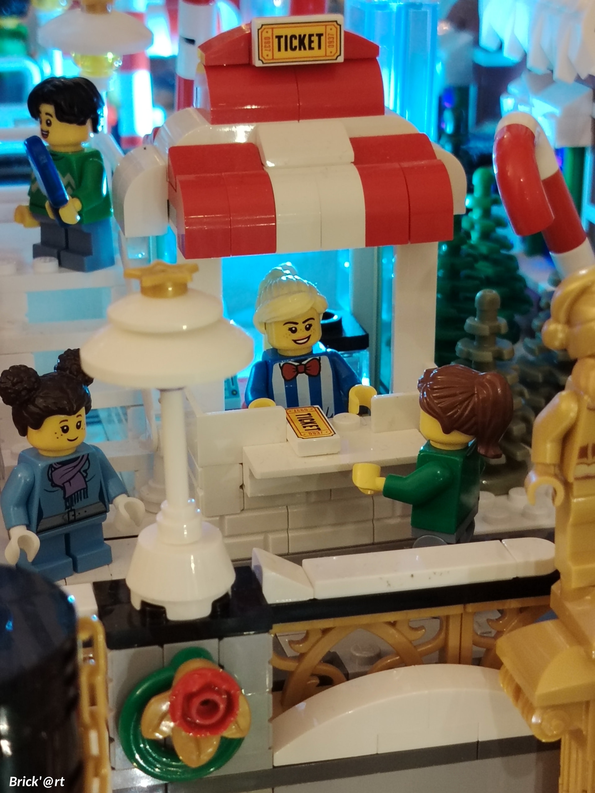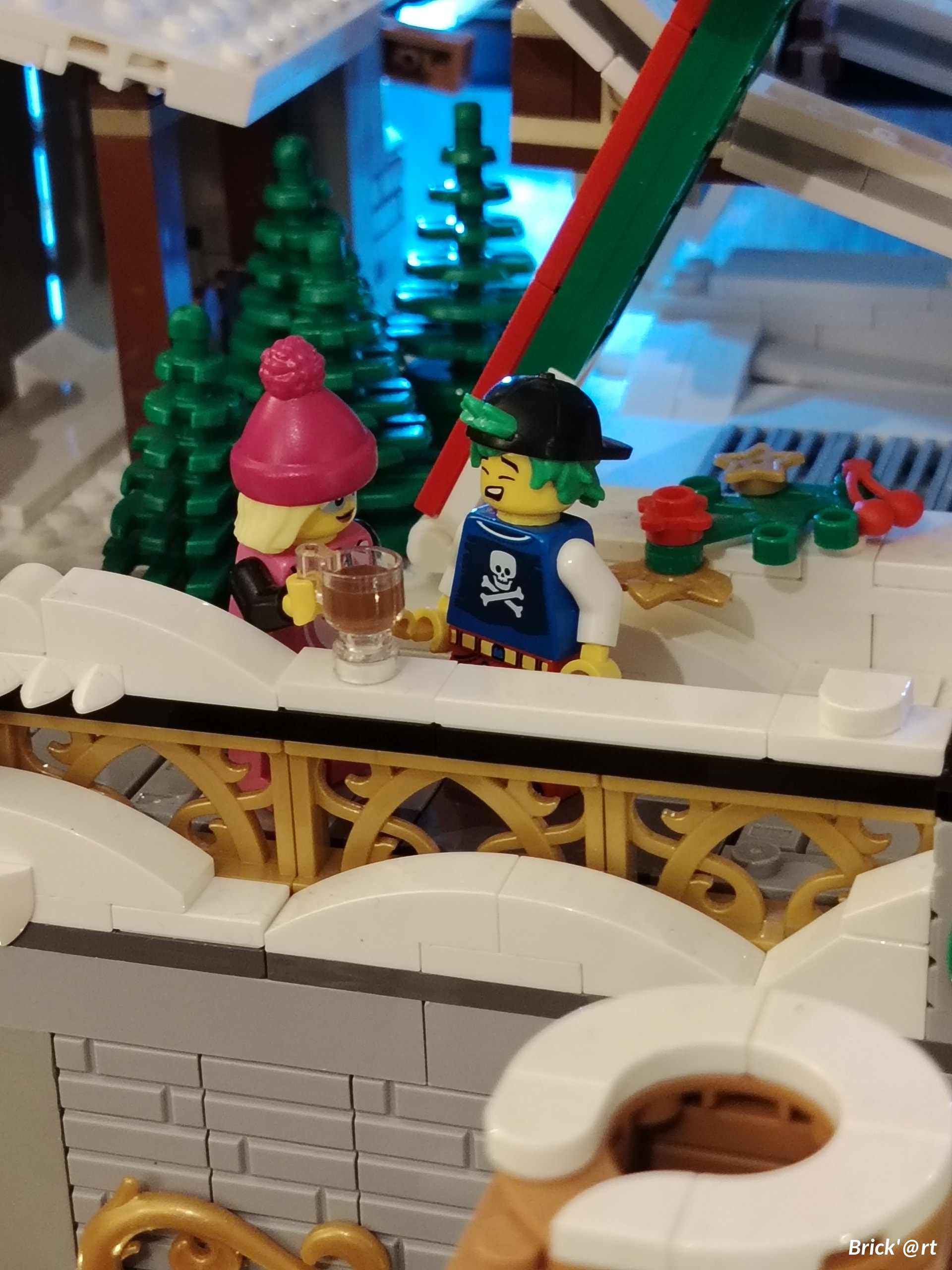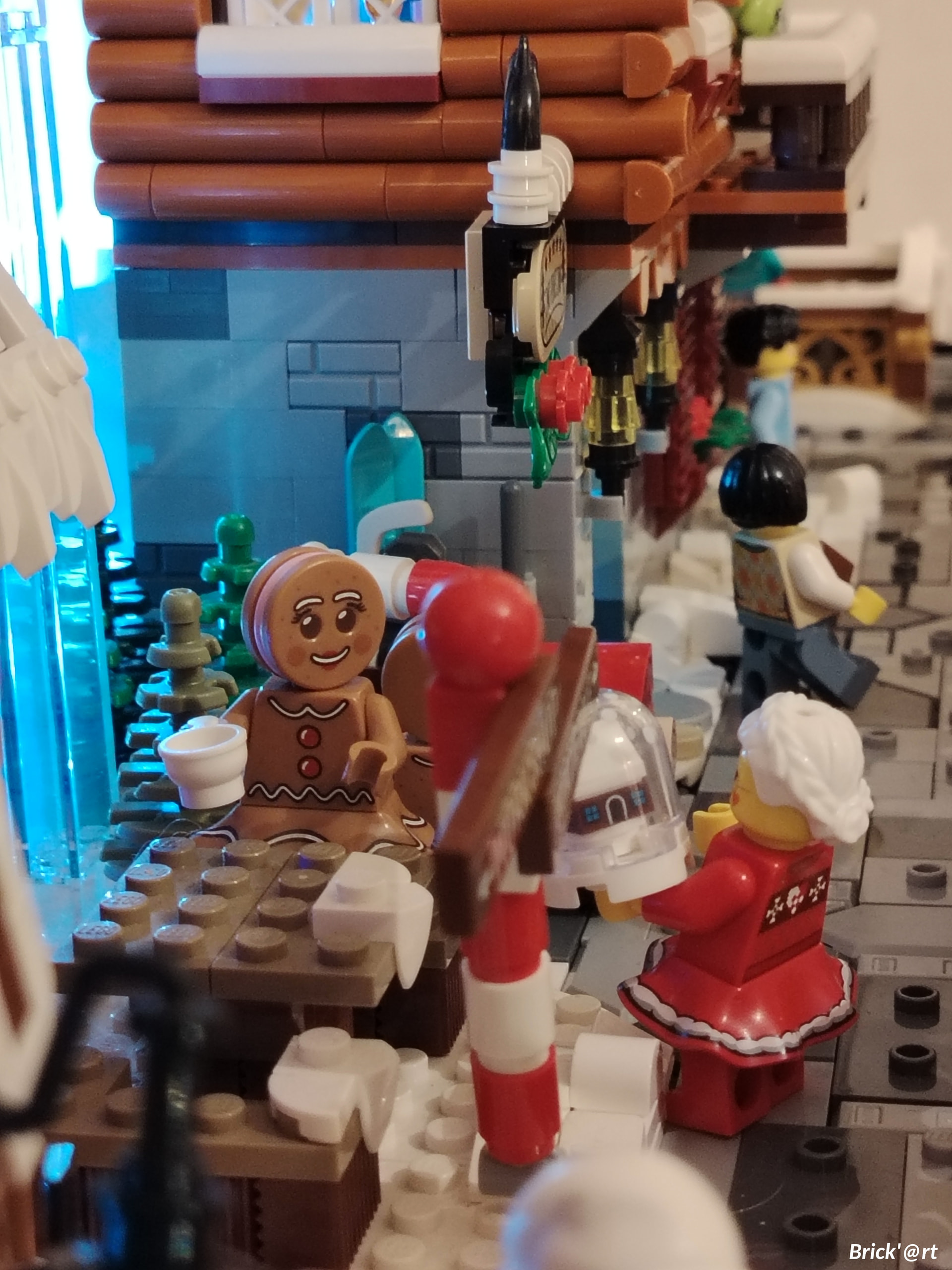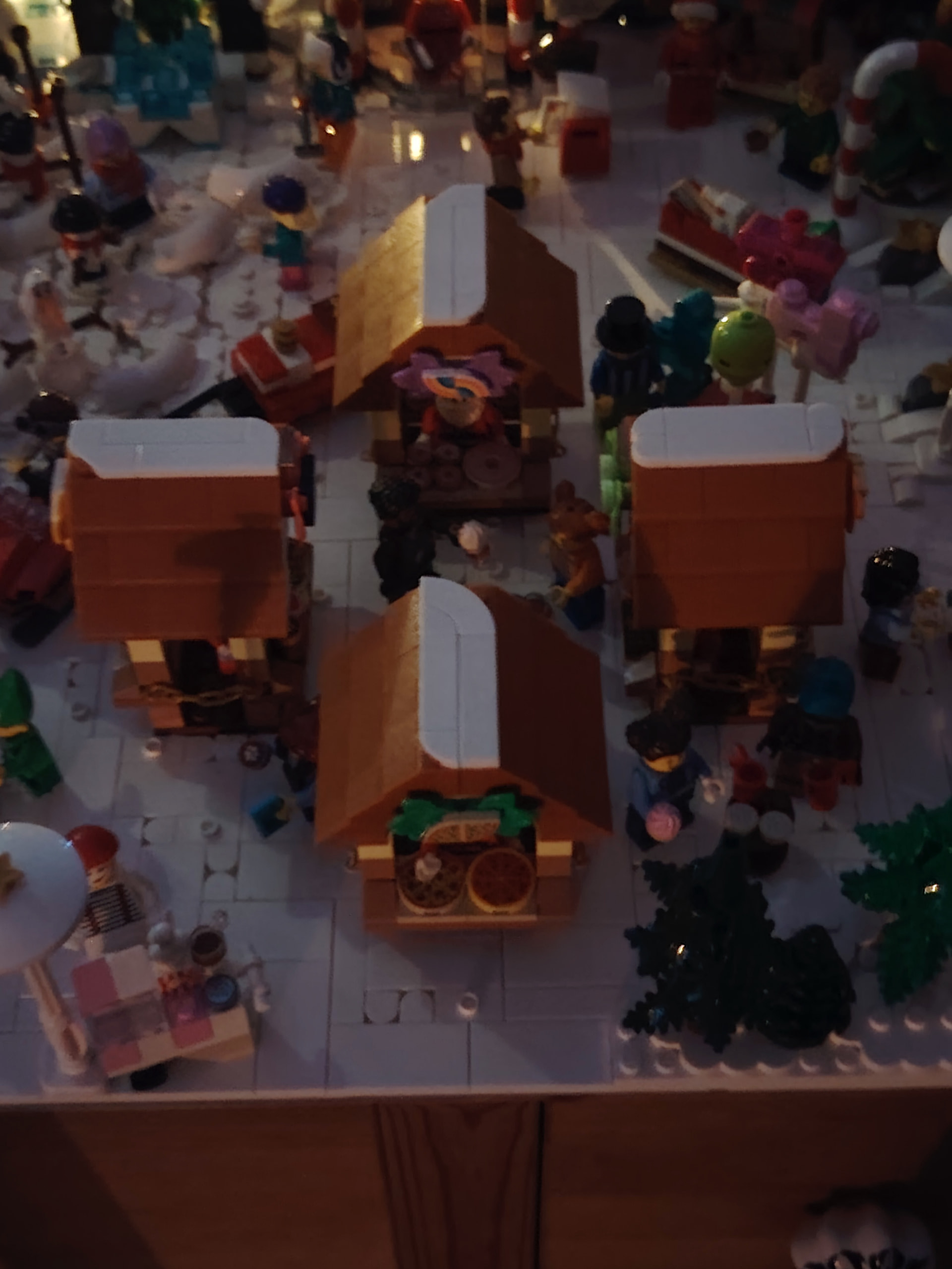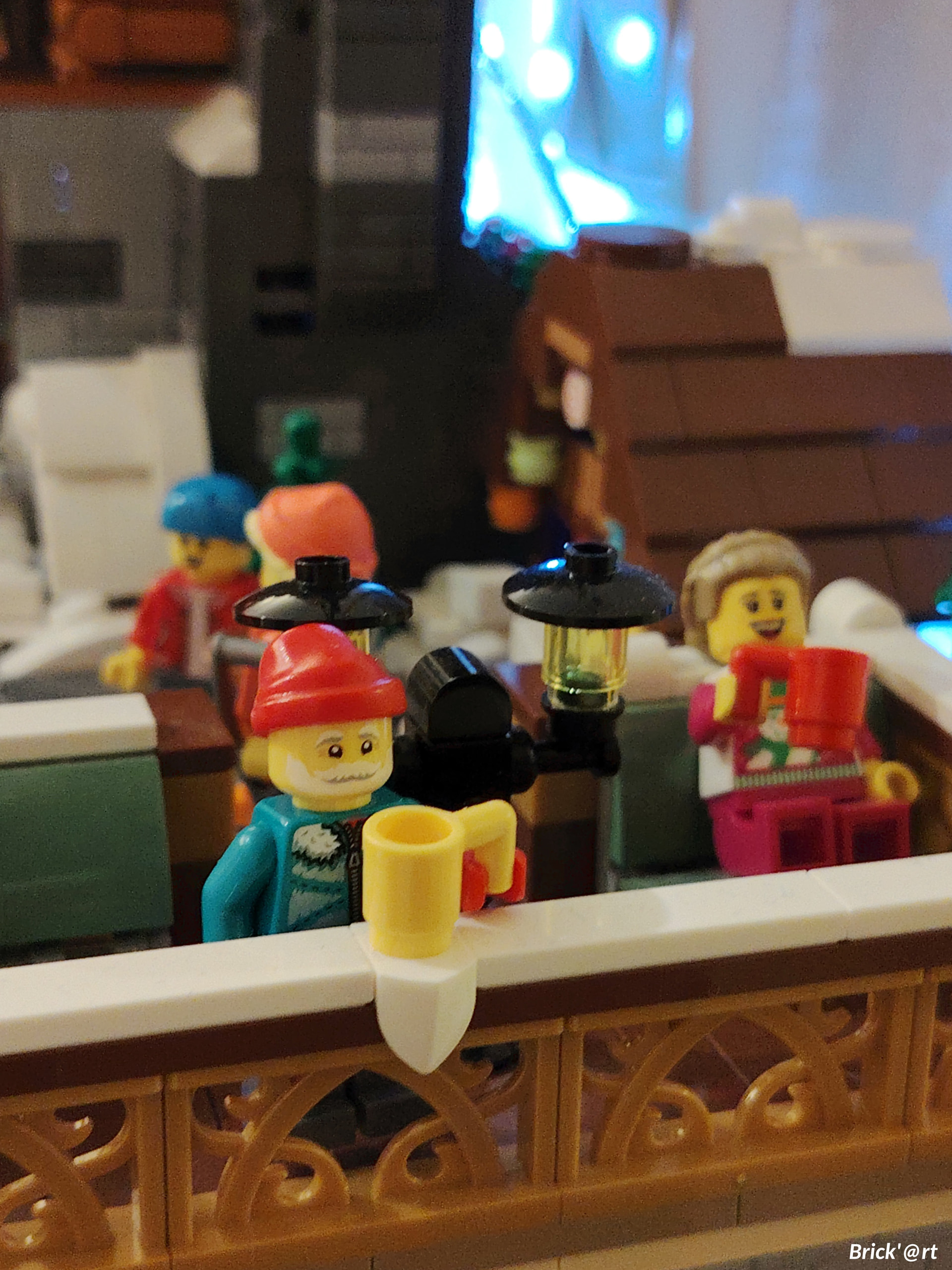 - un espace central au premier plan comprenant une brique custom « Joyeux Noël » accompagné de 2 Casse noisettes en minifigs et 2 bancs