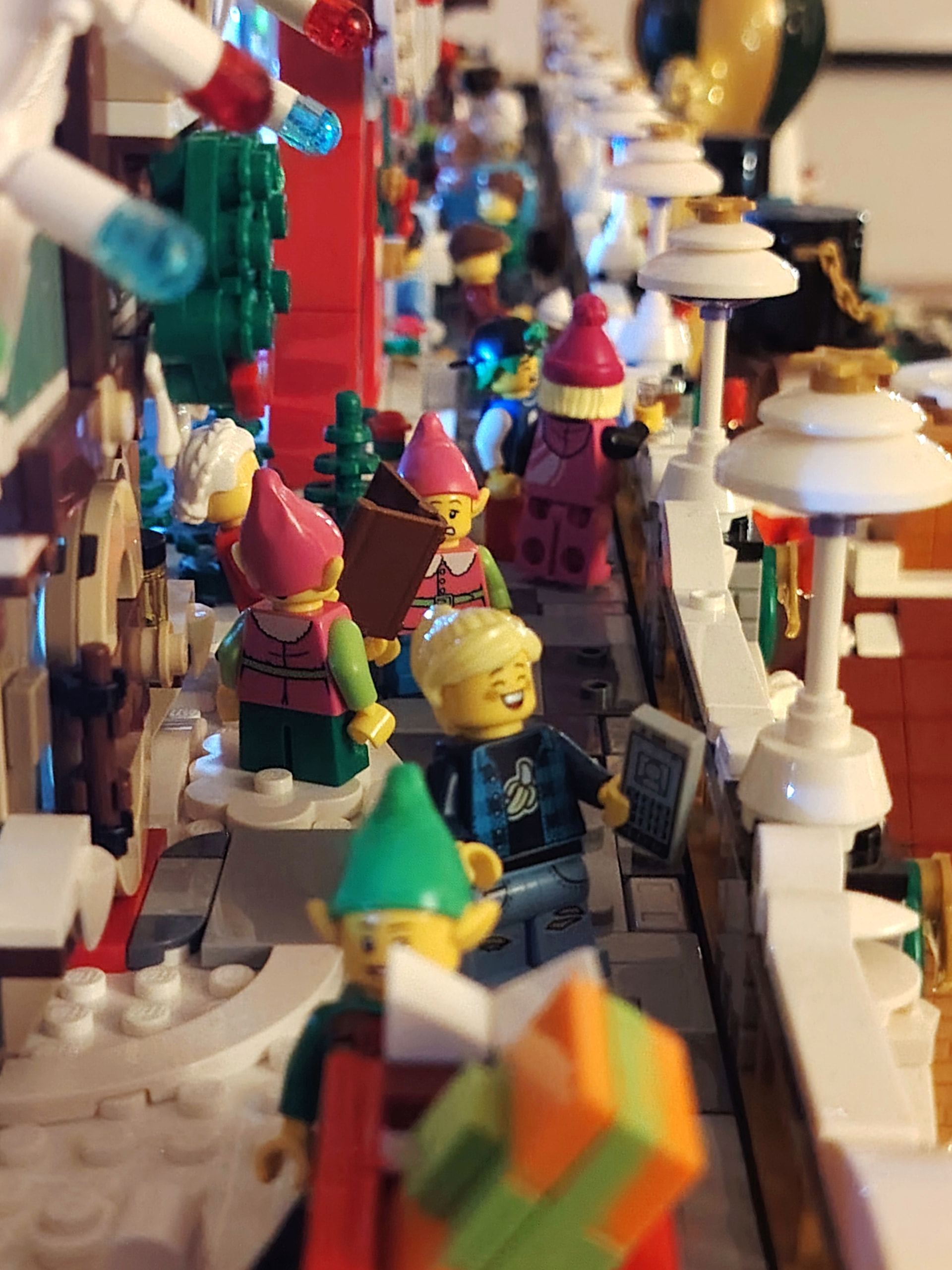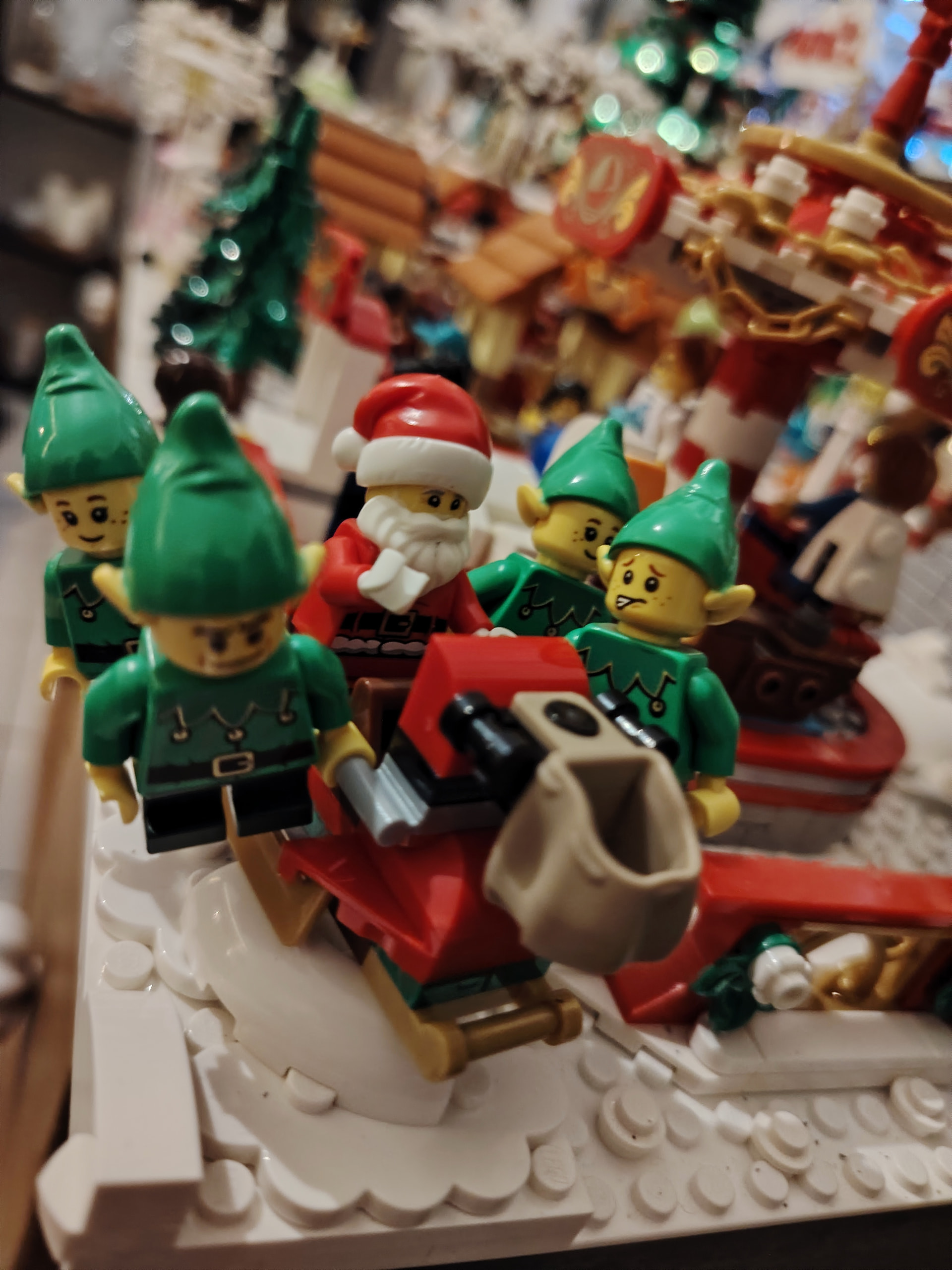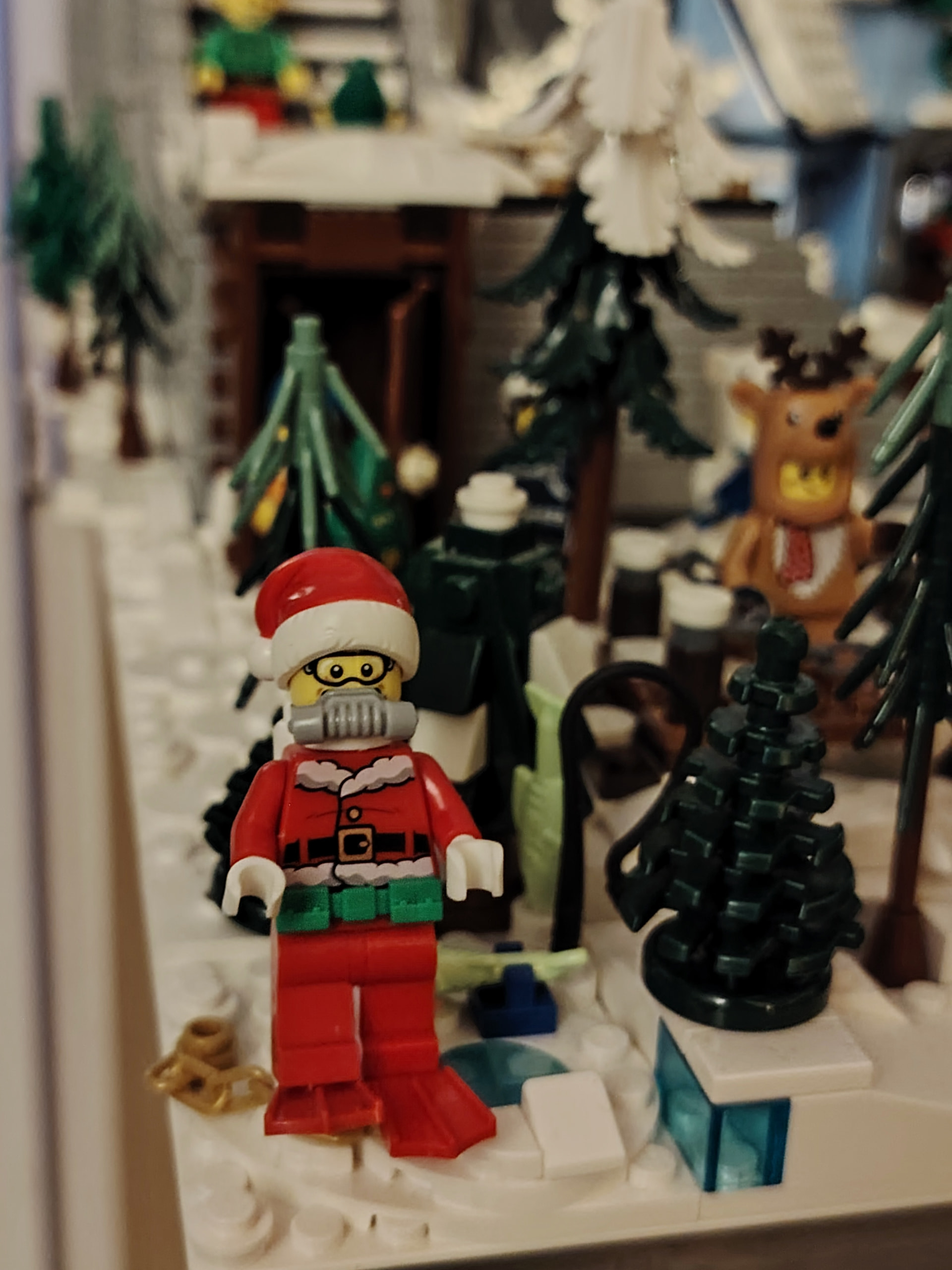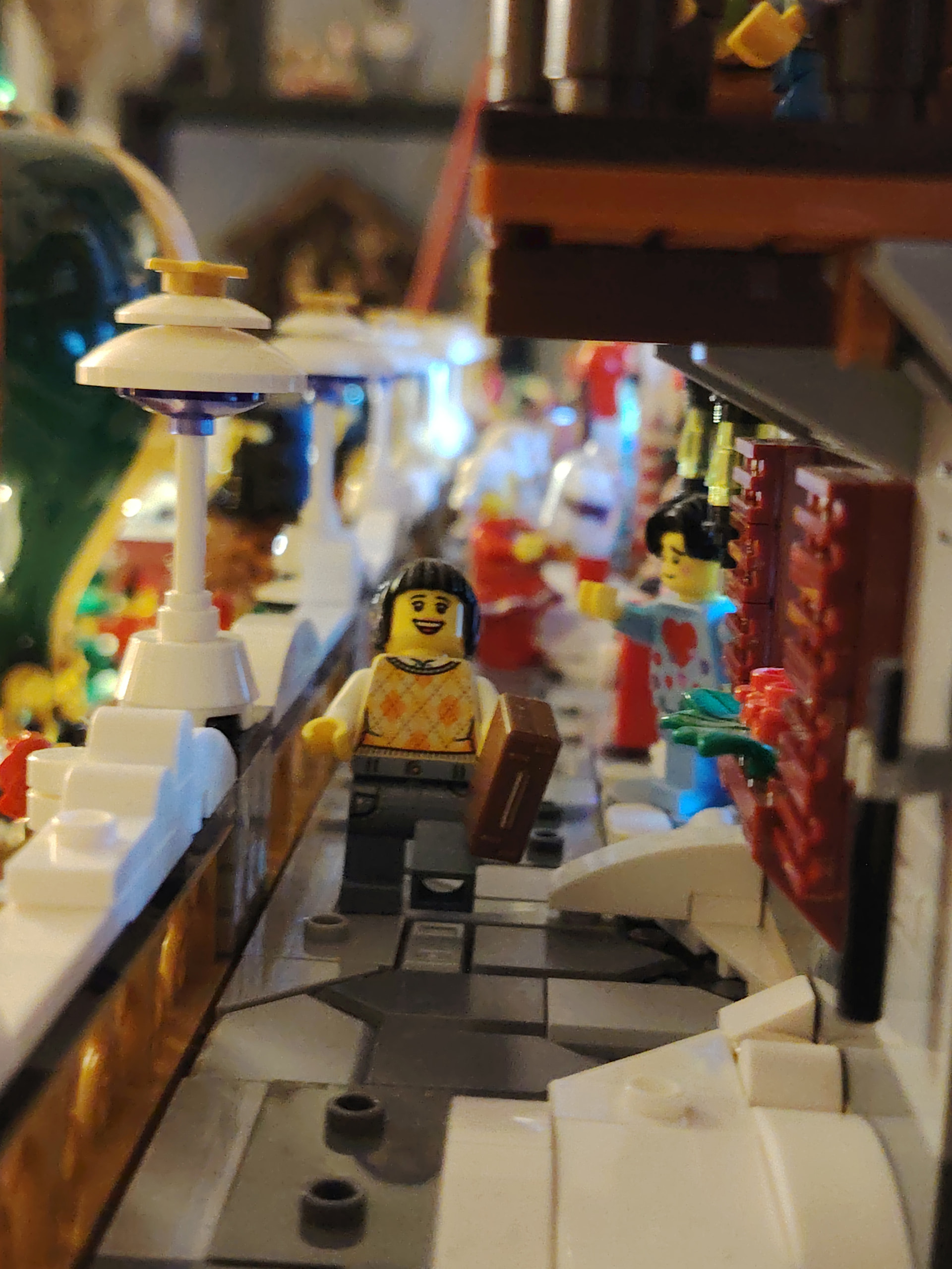 - un espace central au premier plan comprenant une brique custom « Joyeux Noël » accompagné de 2 Casse noisettes en minifigs et 2 bancs