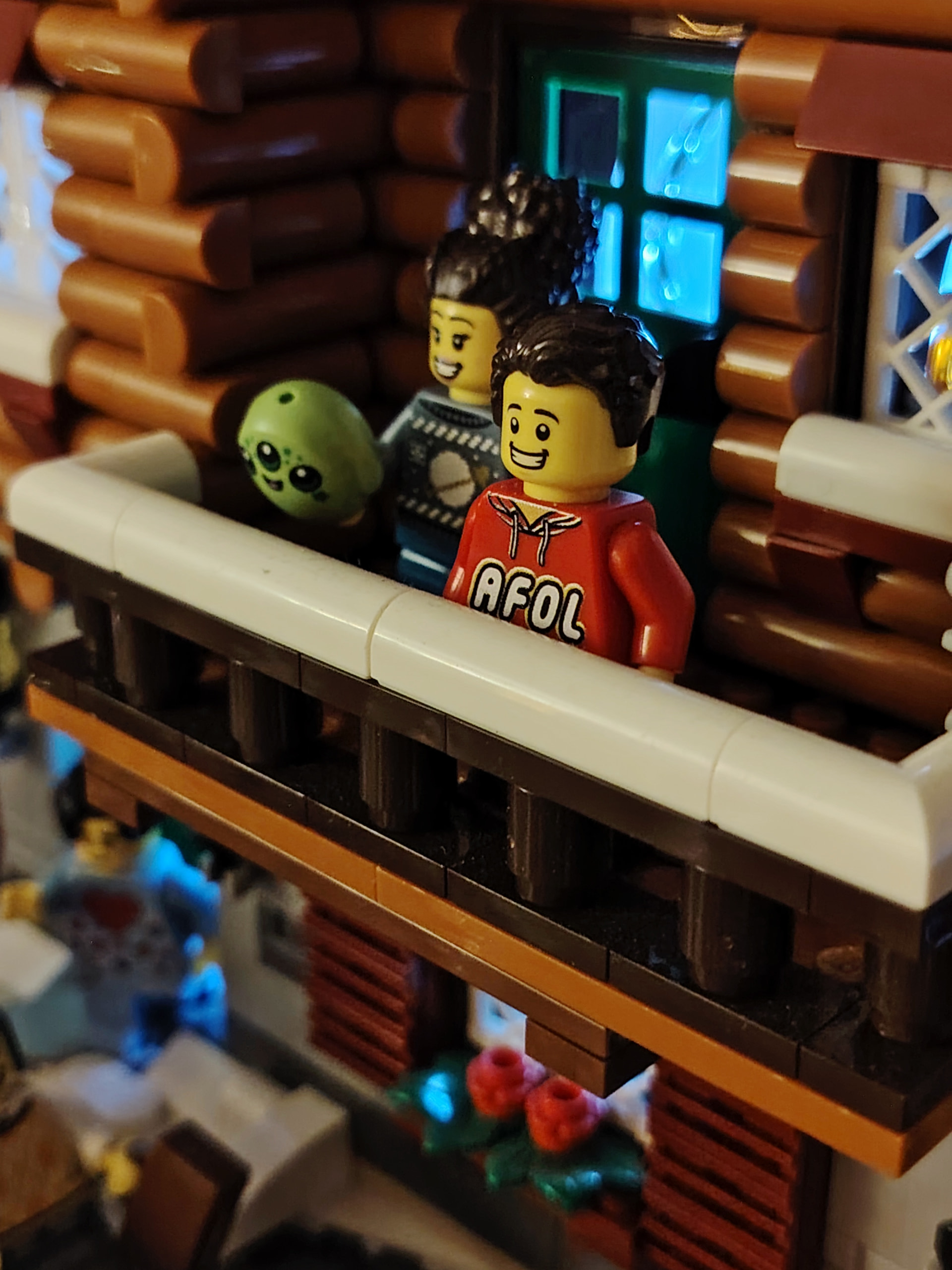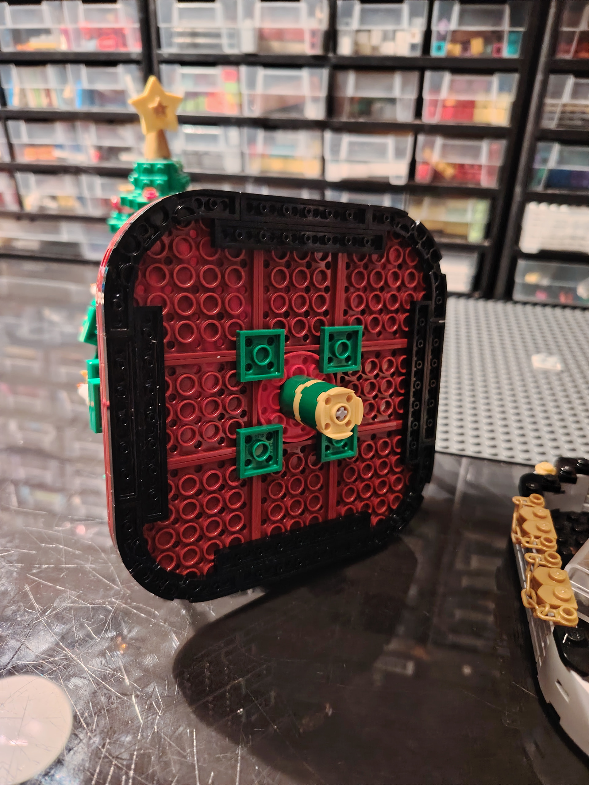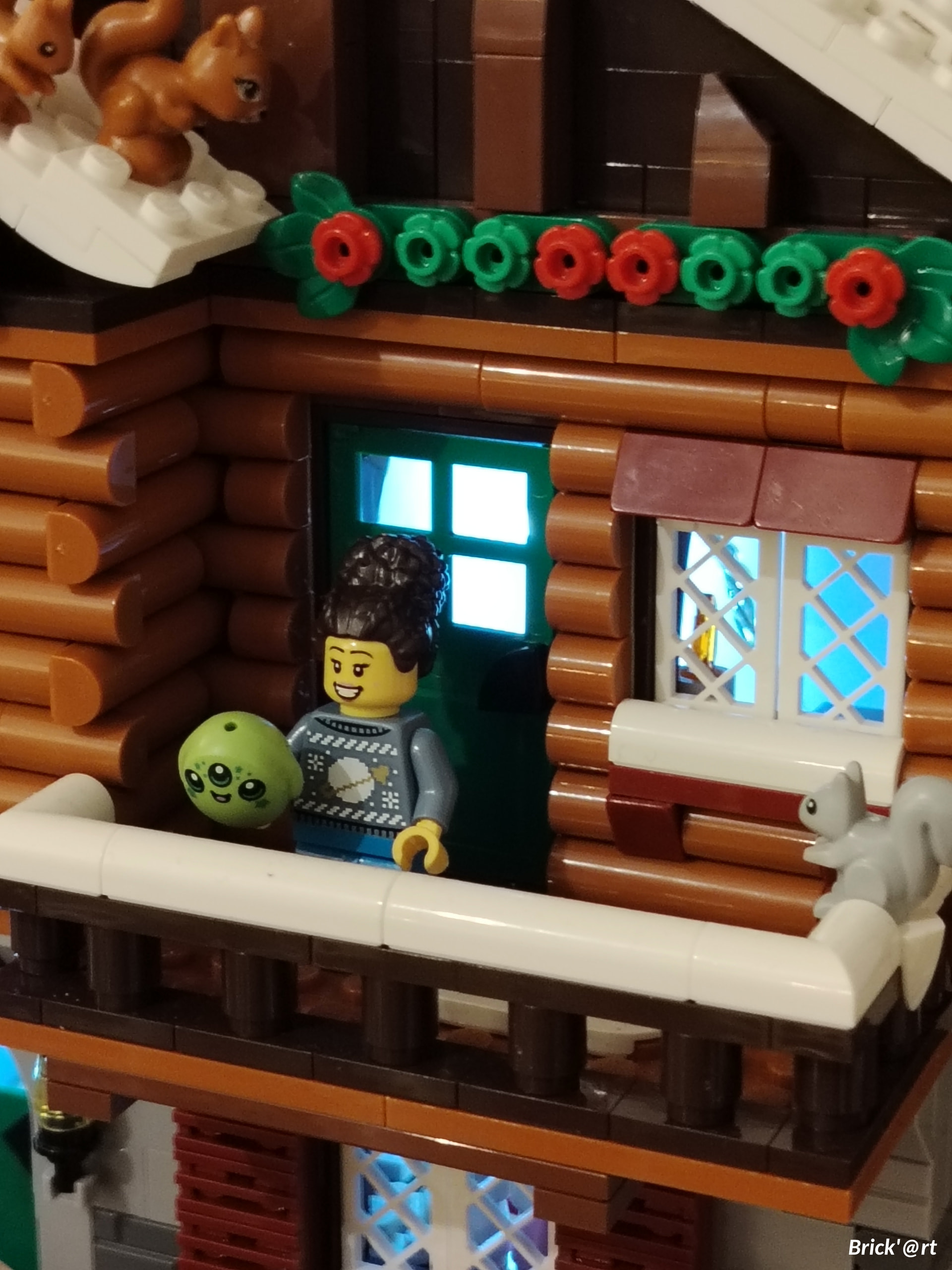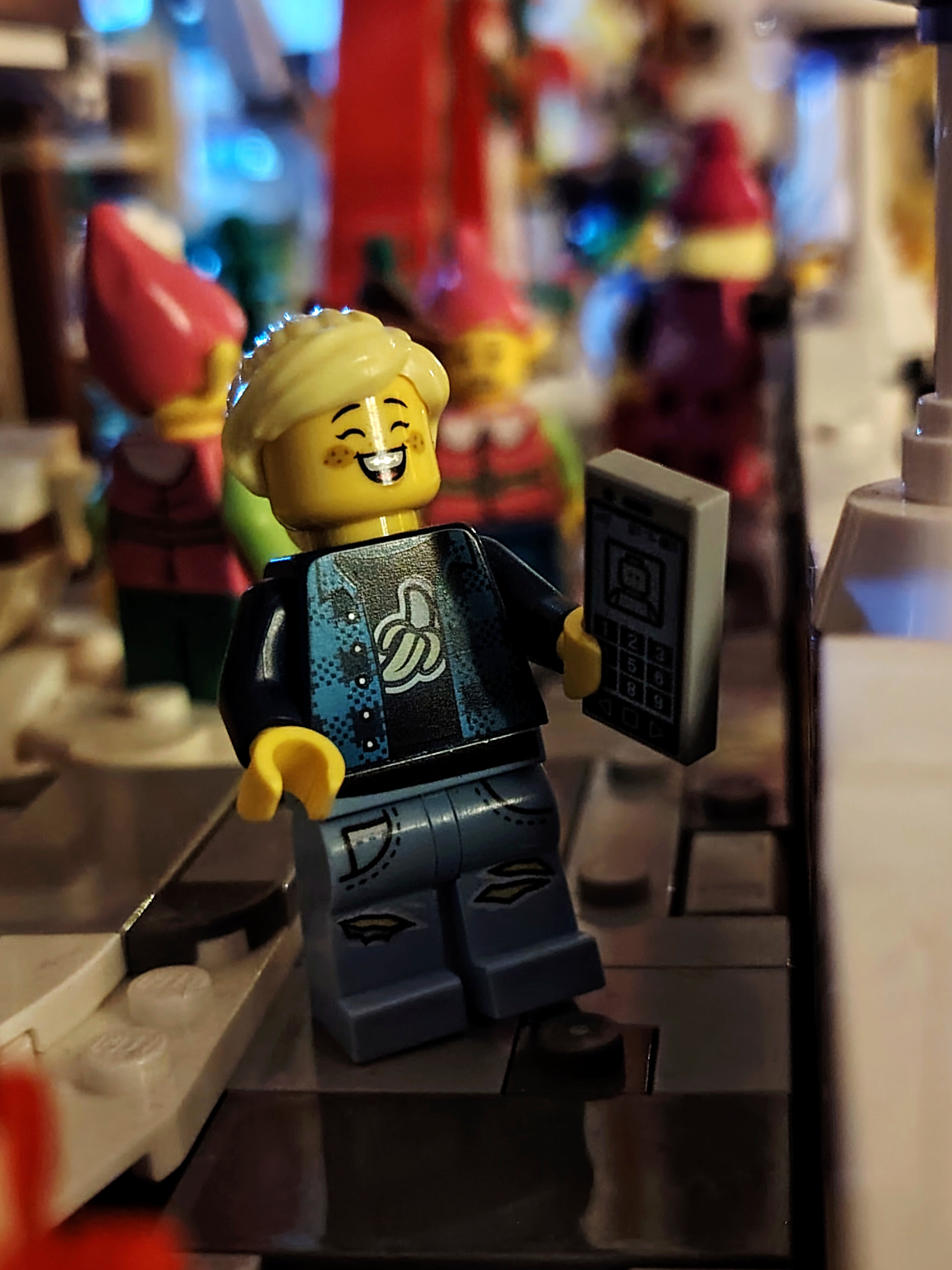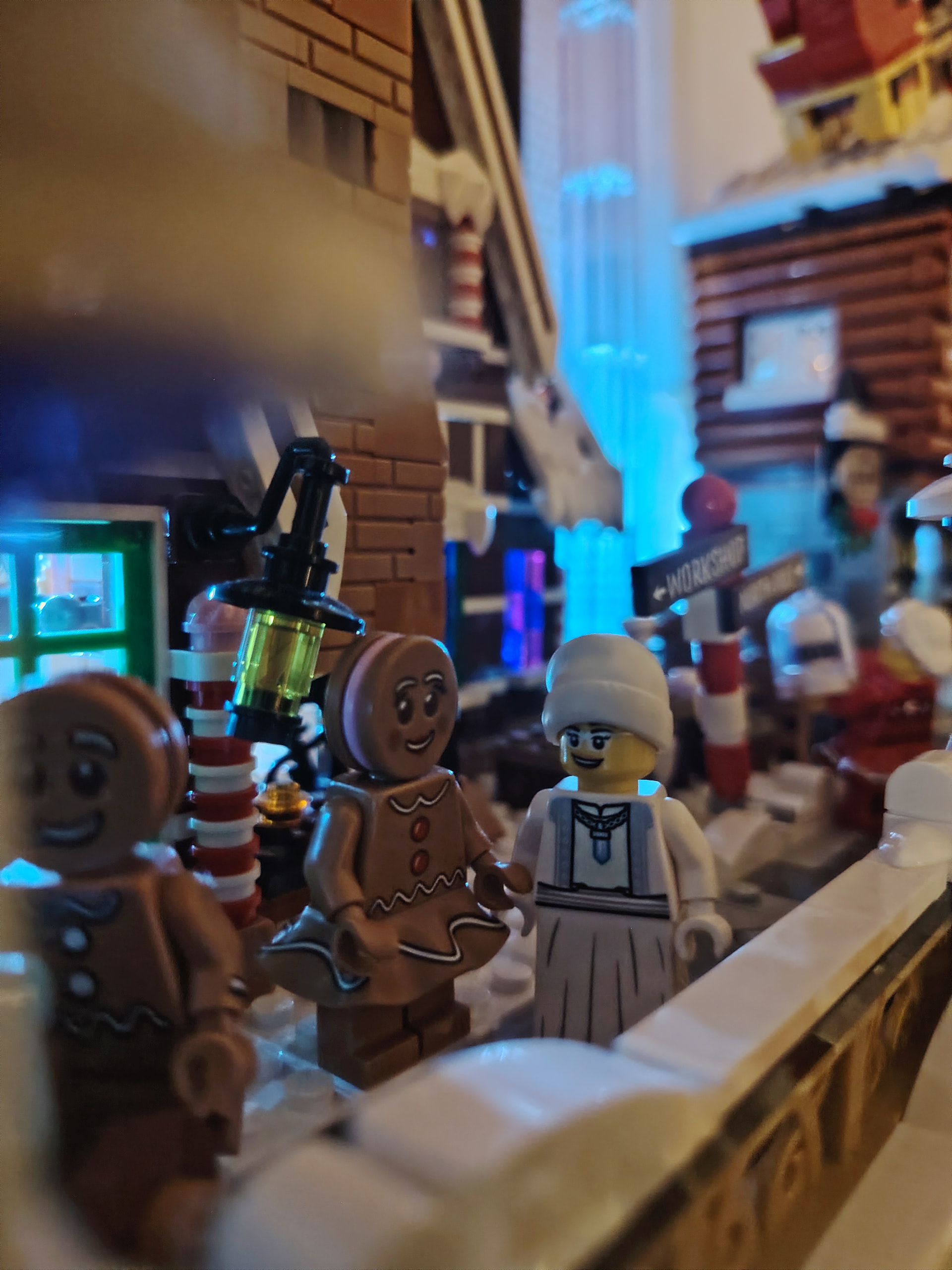 - un espace central au premier plan comprenant une brique custom « Joyeux Noël » accompagné de 2 Casse noisettes en minifigs et 2 bancs