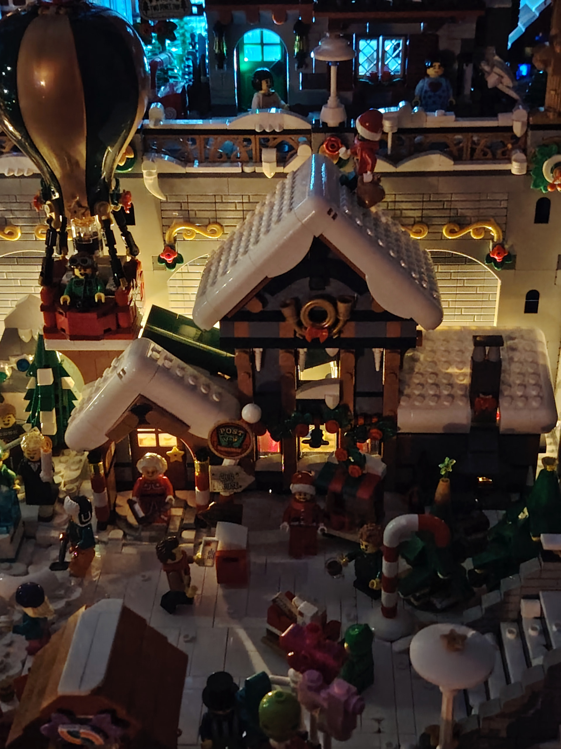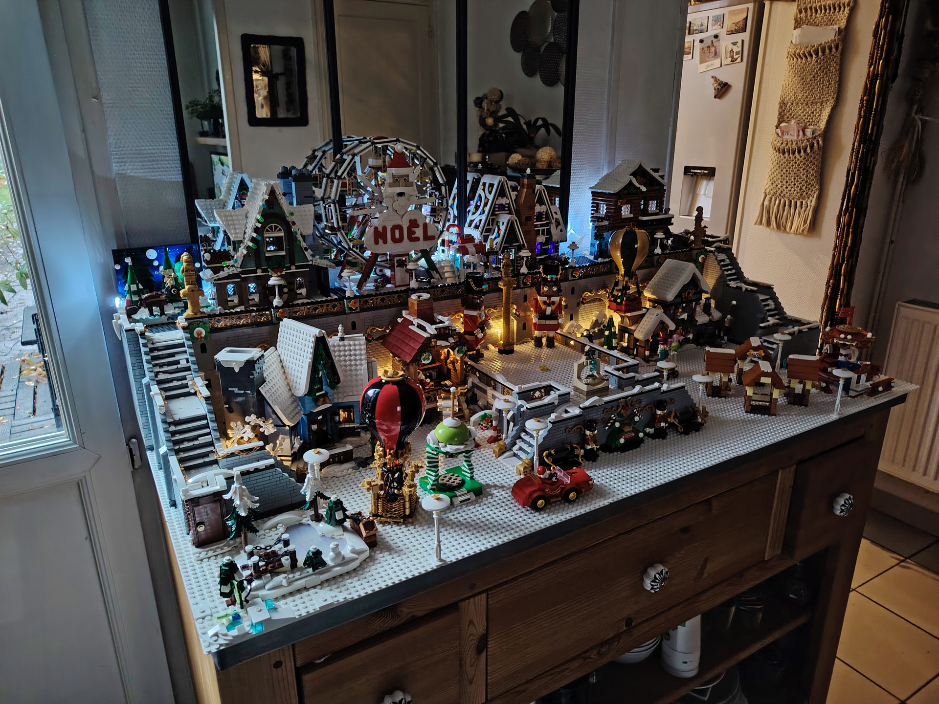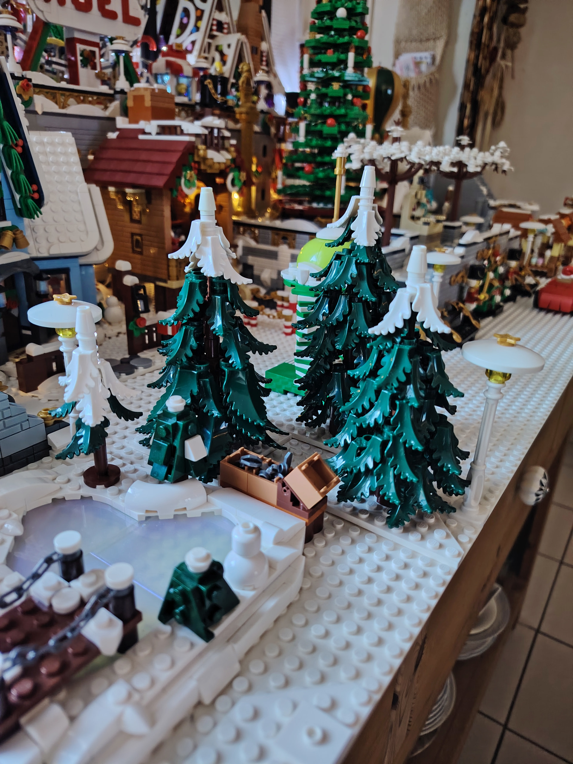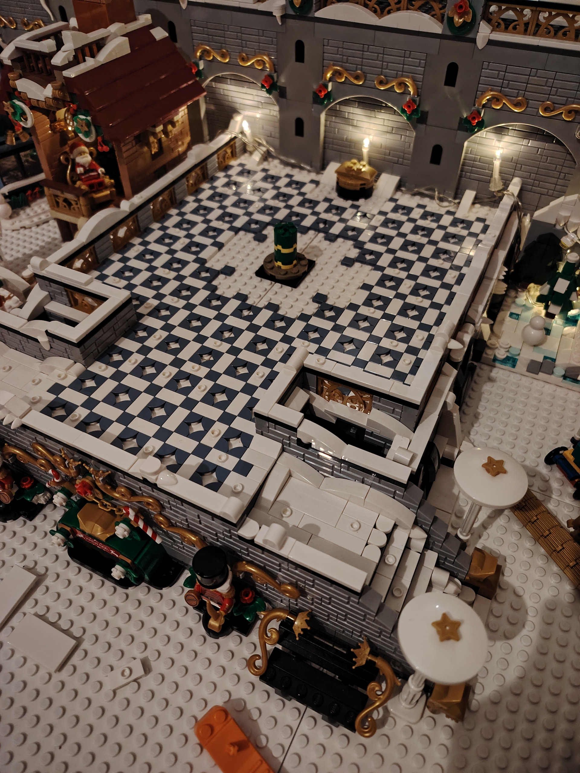 Il est temps à présent de procéder au déménagement sur son emplacement définitif au rez-de-chaussée. En apprenant de mes erreurs du passé, j’en profite pour ajouter les 2 guirlandes avant de placer tous les bâtiments ![]()