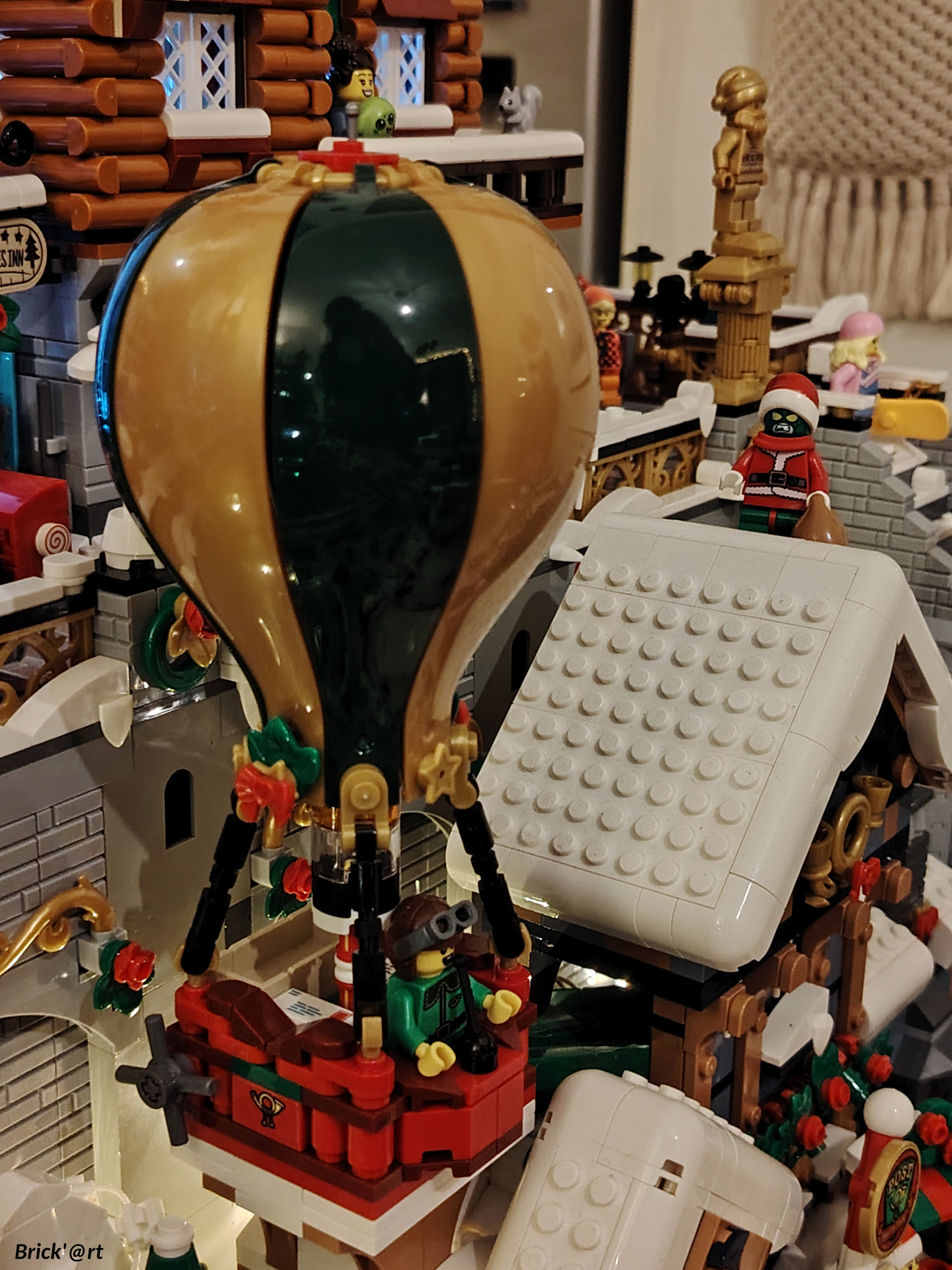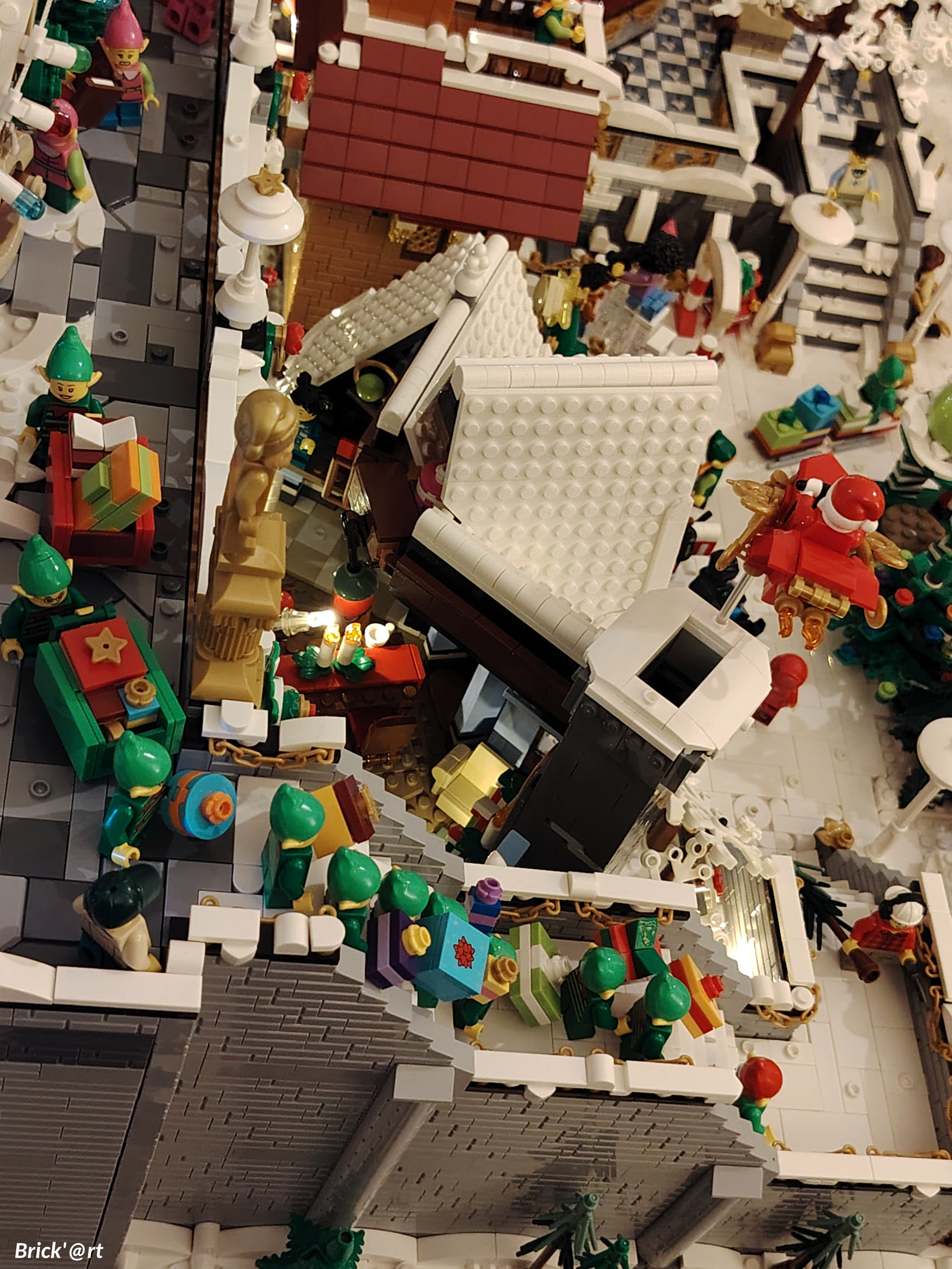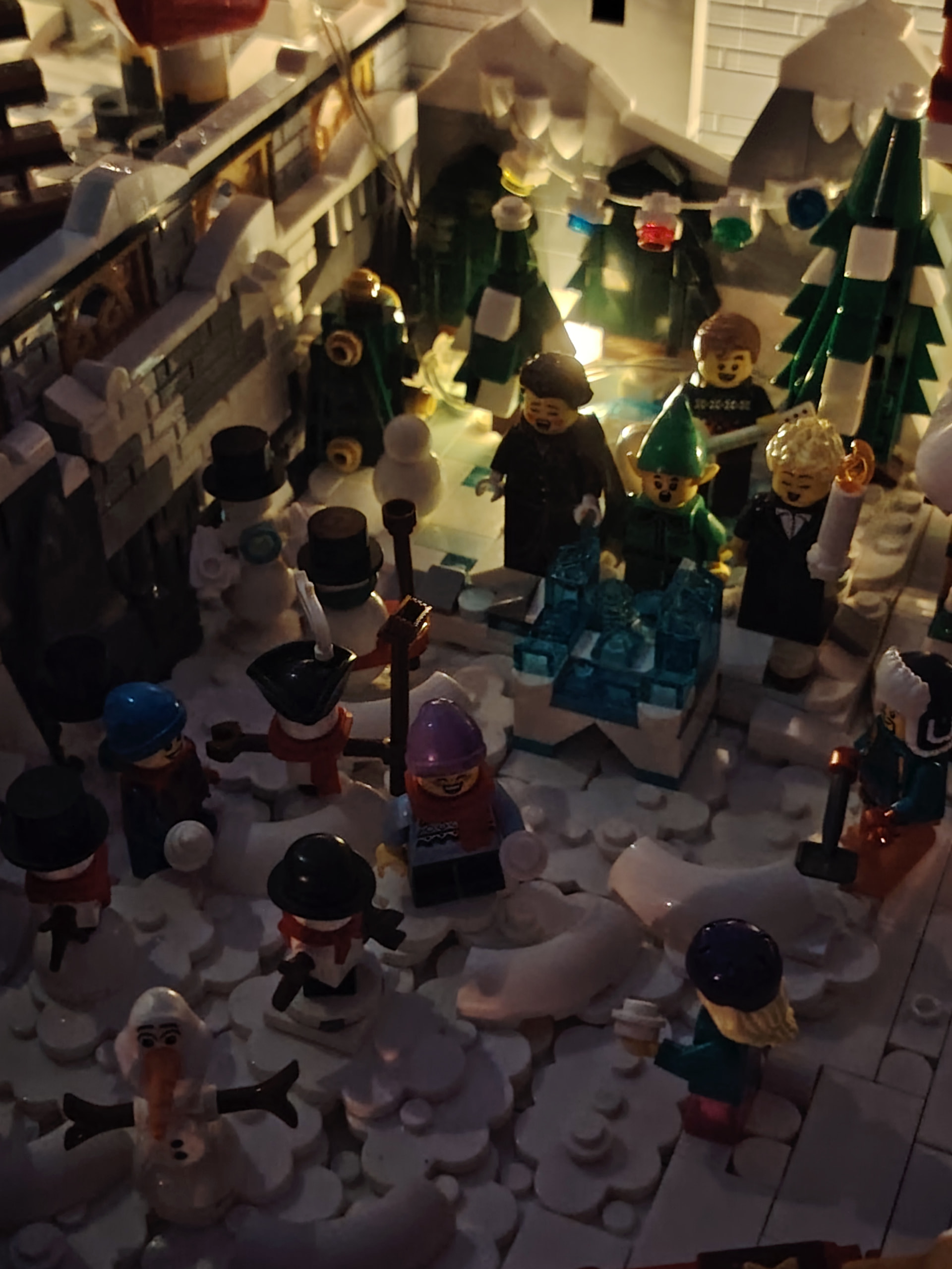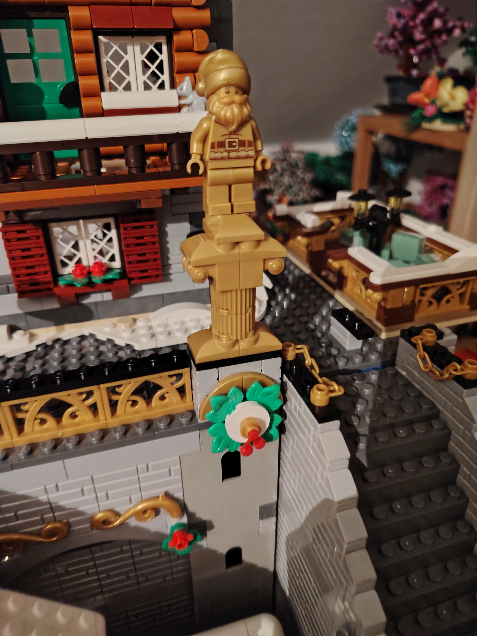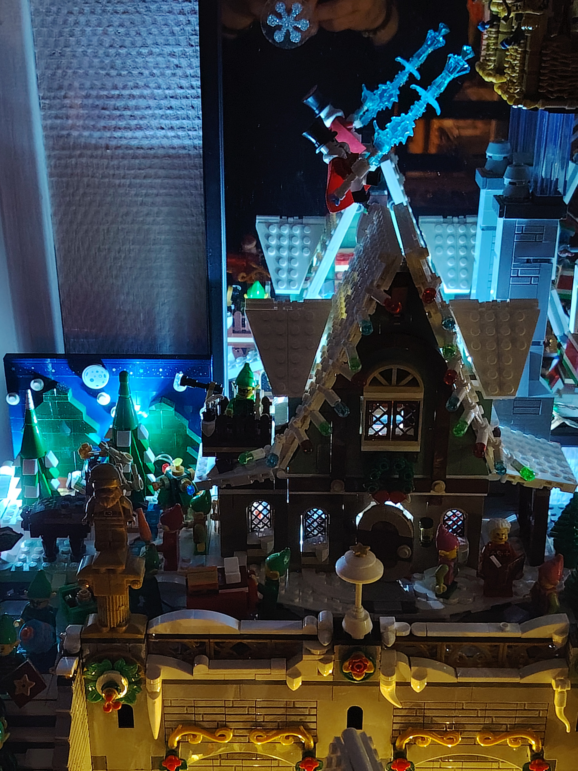 Il est temps à présent de procéder au déménagement sur son emplacement définitif au rez-de-chaussée. En apprenant de mes erreurs du passé, j’en profite pour ajouter les 2 guirlandes avant de placer tous les bâtiments ![]()