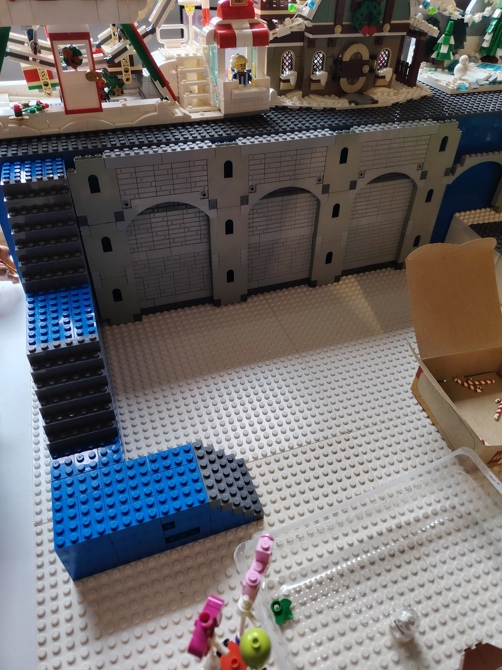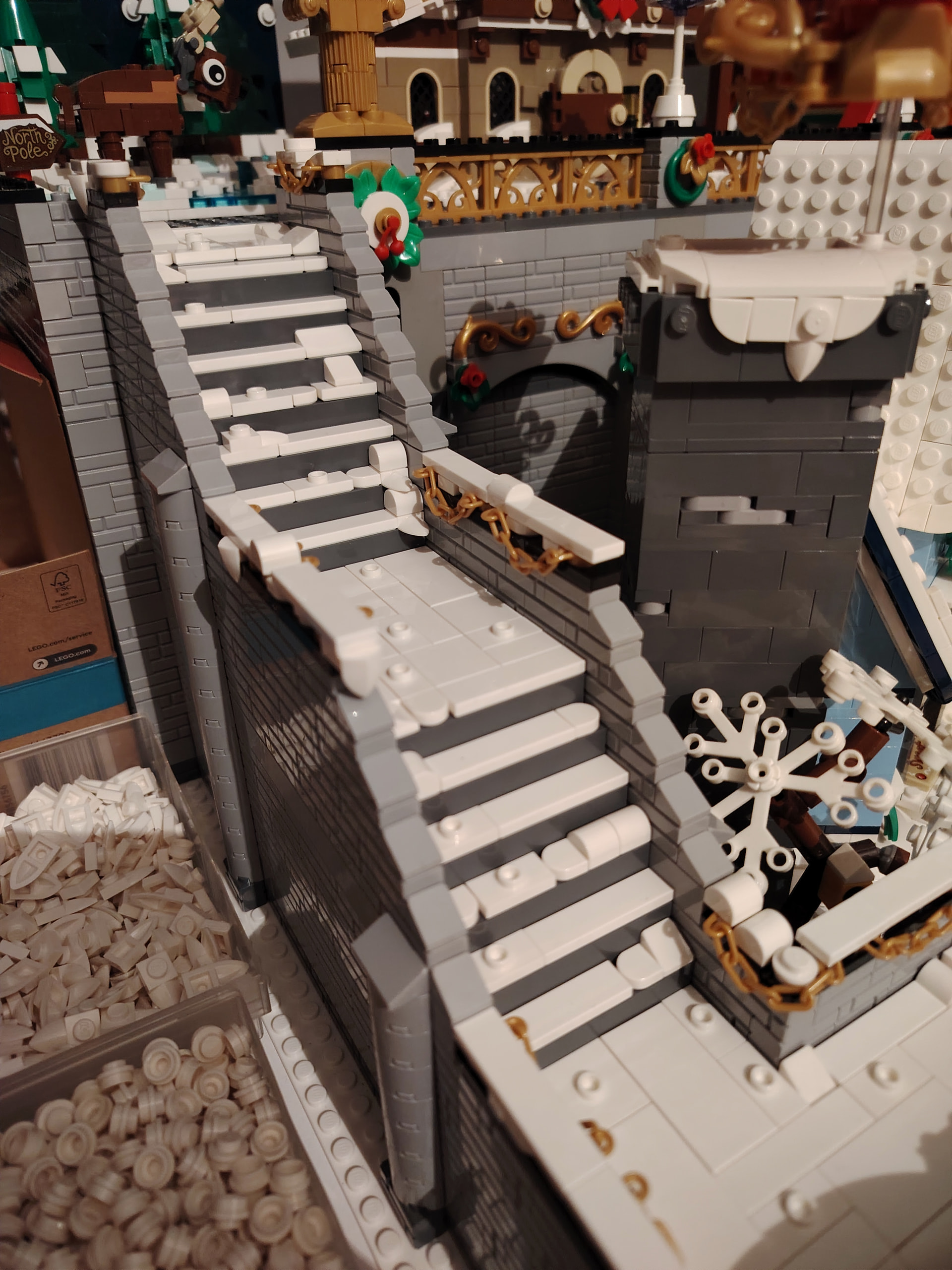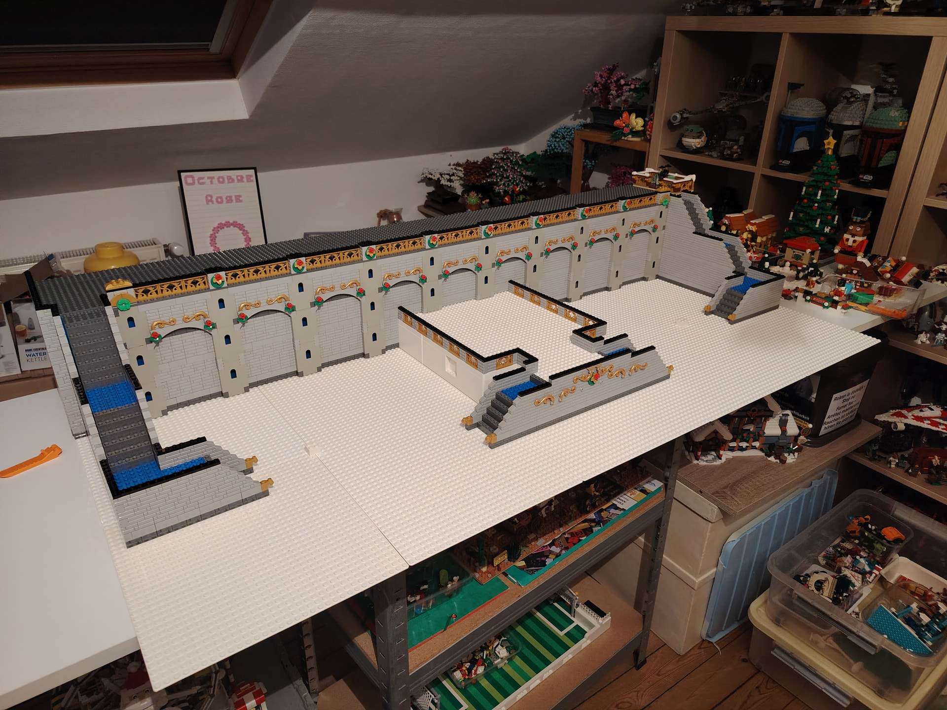Pour changer de l’an dernier, le grand escalier central est remplacé par une « place » réhaussée à l’aide des boites Ikea - Lego. Et L’accès à la partie haute du diorama se fera donc par des escaliers déportés sur les côtés du diorama.