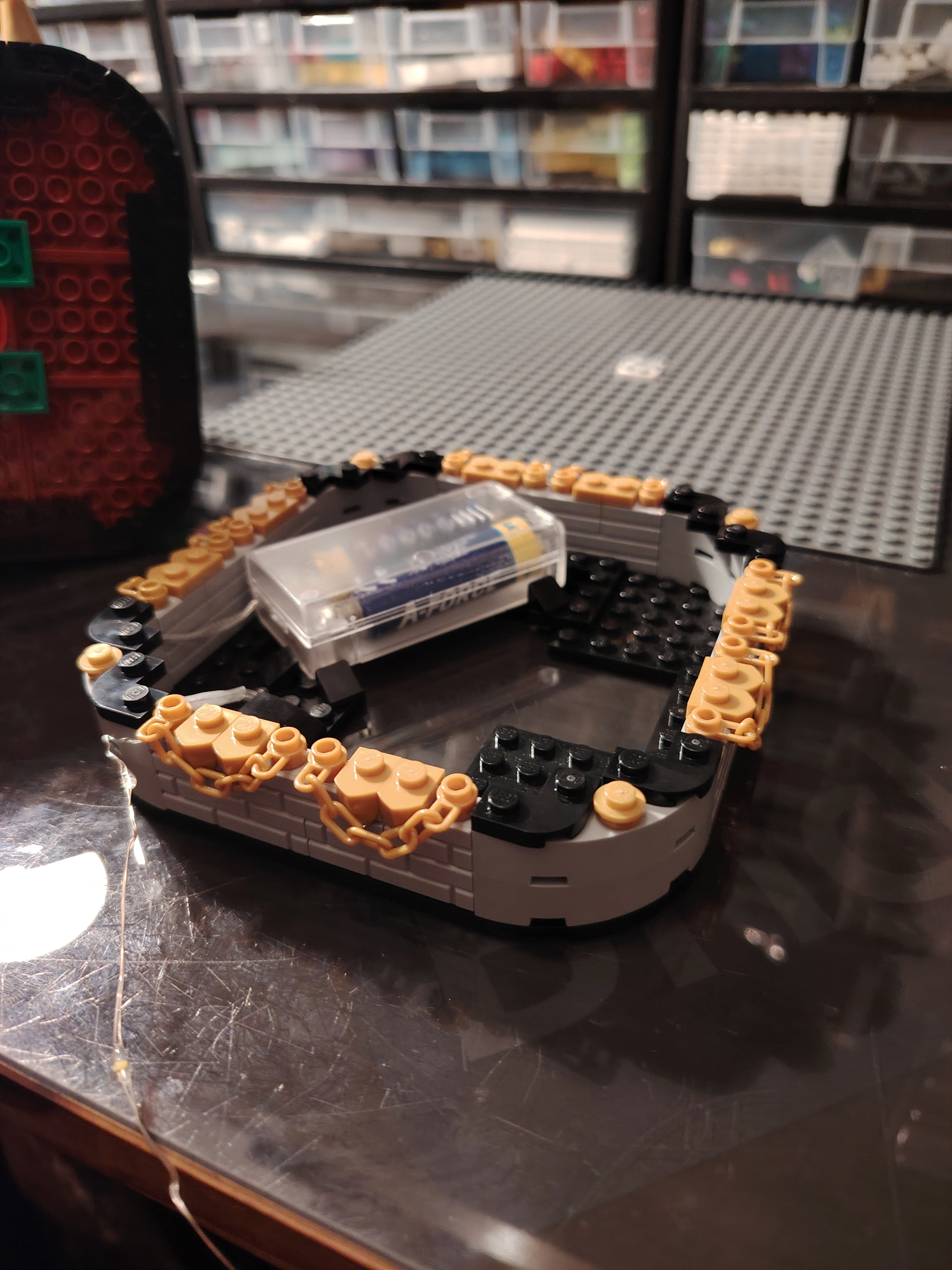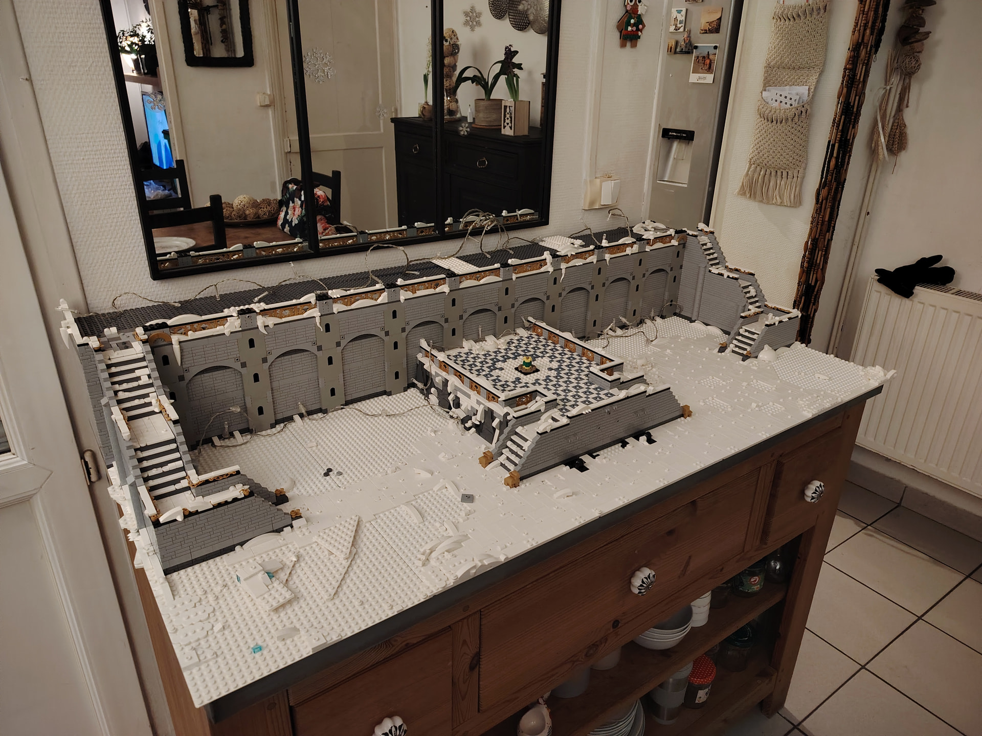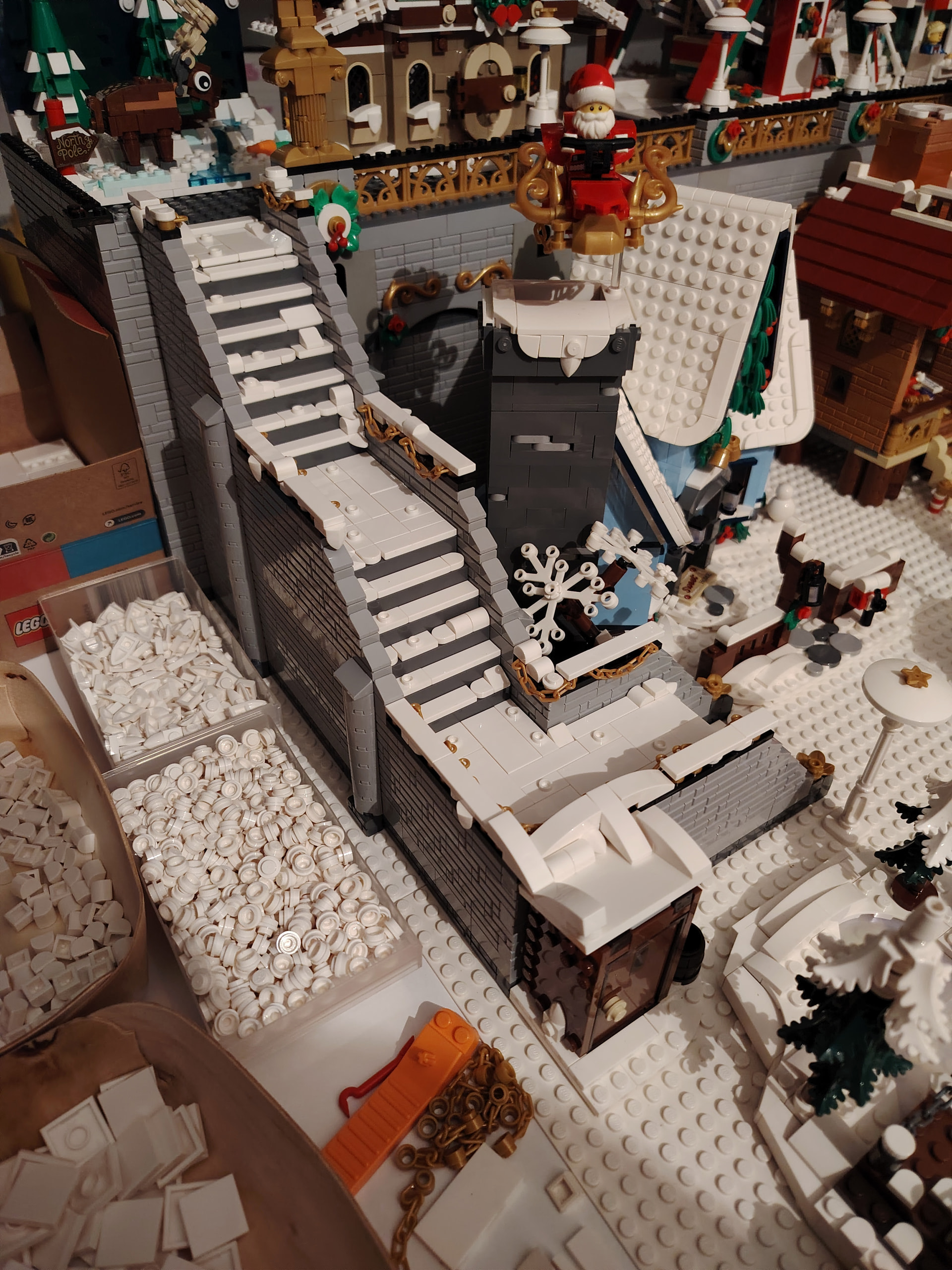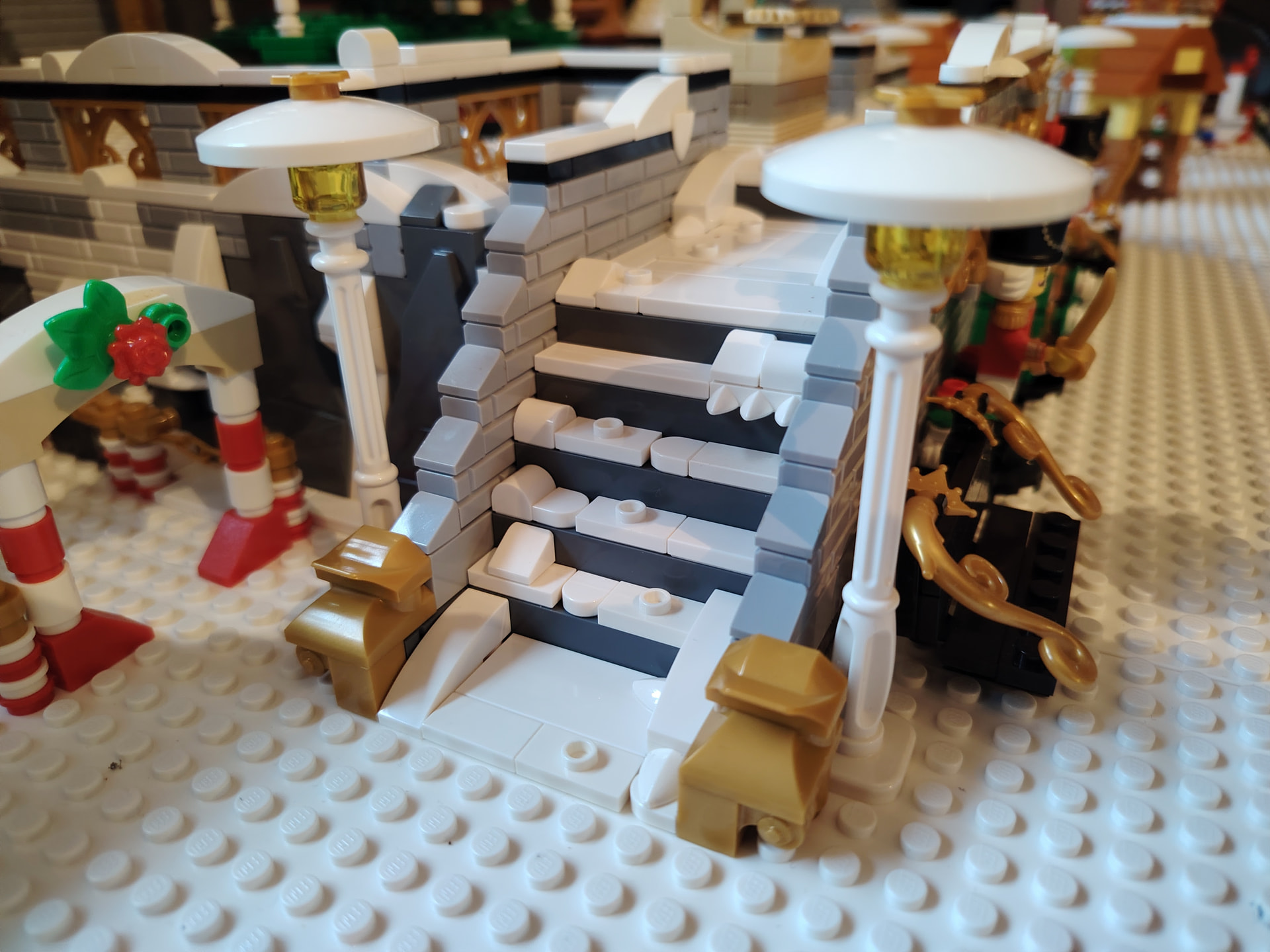 Pour changer de l’an dernier, le grand escalier central est remplacé par une « place » réhaussée à l’aide des boites Ikea - Lego. Et L’accès à la partie haute du diorama se fera donc par des escaliers déportés sur les côtés du diorama.