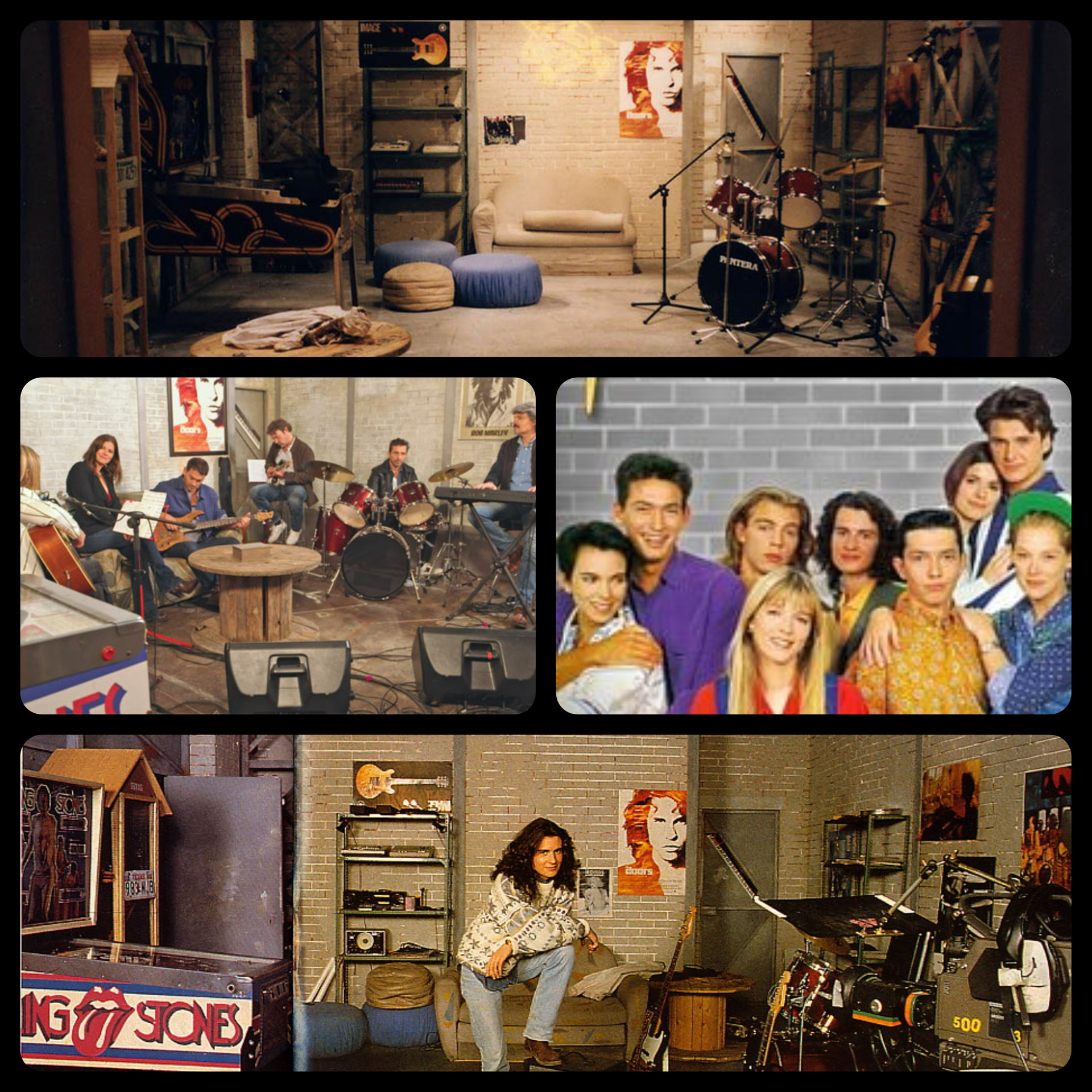 Série française emblématique des années 90 qui a perdurée jusque 2025. Les principaux personnages (Hélène…qui s’appelle Hélène, son amoureux Nicolas, José au Synthé’, Laly, Bénédicte, Joanna l’américaine et son Cri-Cri d’amour à la batterie) représentés ici ,dans le garage, pour leur sessions musicales.